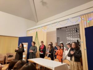 Cały czas towarzyszyły im występy dziecięcych zespołów z gminnych przedszkoli oraz studia wokalnego CK Izabelin. Nasze dziewczęta również zapragnęły wystąpić na scenie. Po ustaleniu szczegółów z organizatorem dały wspaniały występ a capella z piosenką „Gore gwiazda”. Na koniec miały też okazję zrobić sobie zdjęcie z Mikołajem oraz z panią wójt Dorotą Zmarzlak. Pełne wrażeń wróciły do Internatu na kolację.