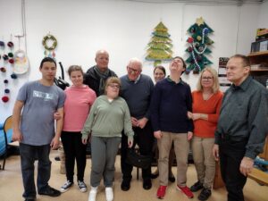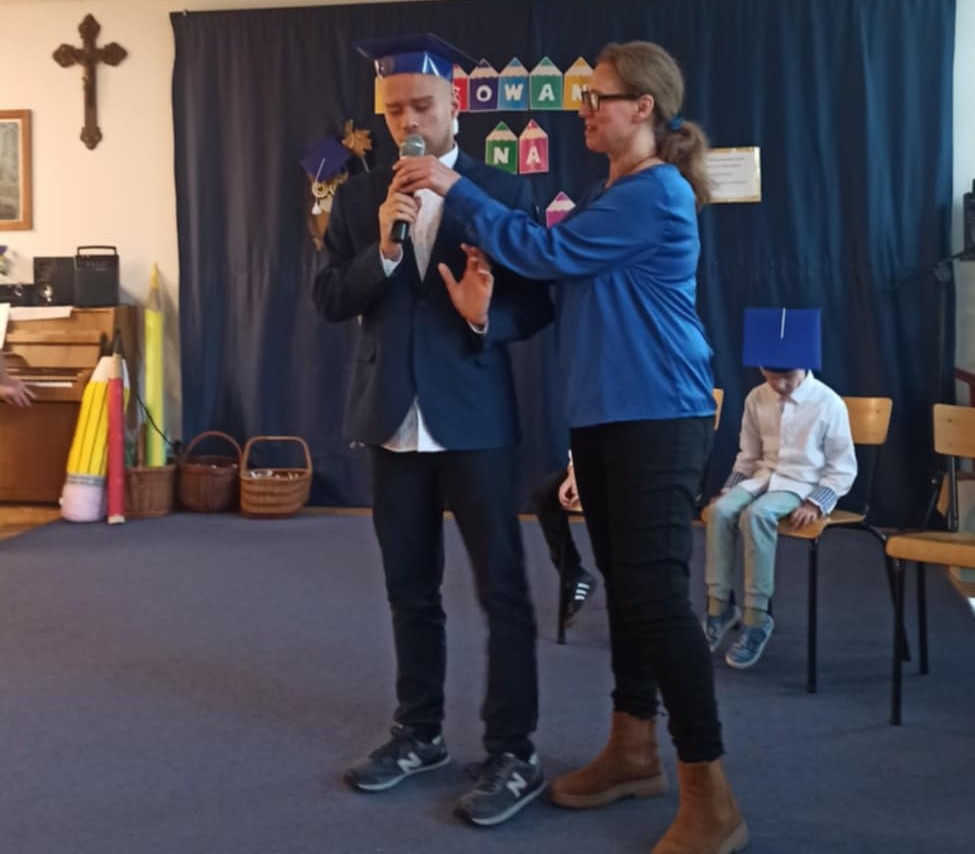 Osoby kończące prace w Szkole św. Maksymiliana z karykaturami