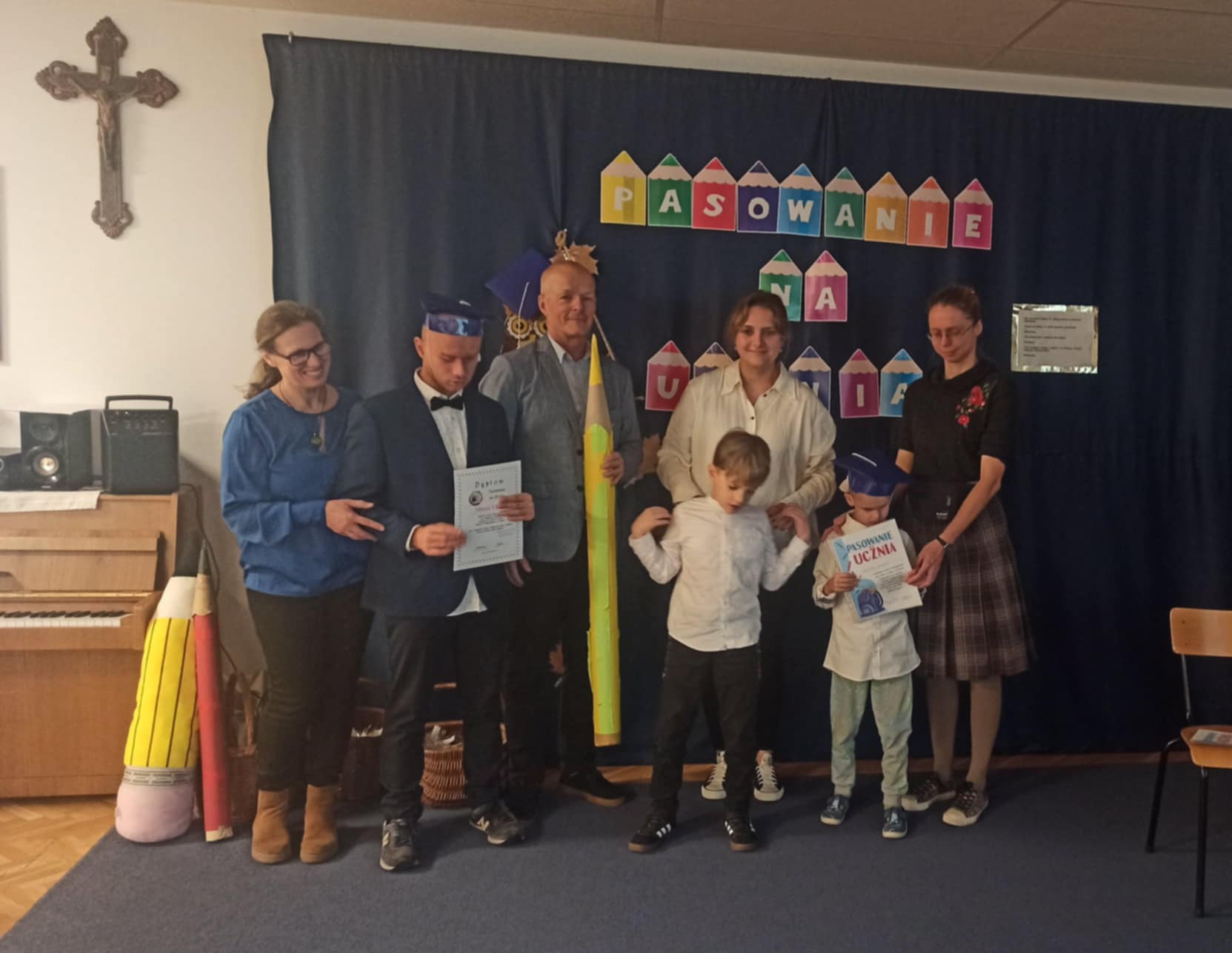 zdjecie grupowe pasowanych-uczniow z nauczycielami oraz z pania dyrektor i z panem dyrektorem