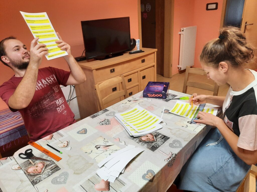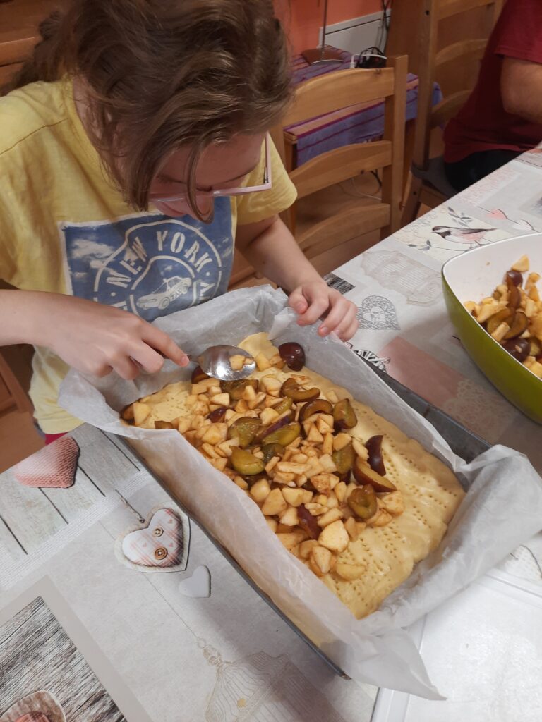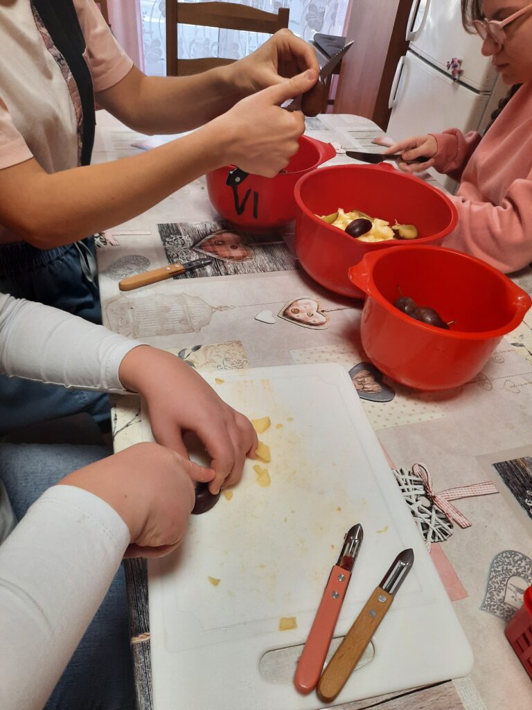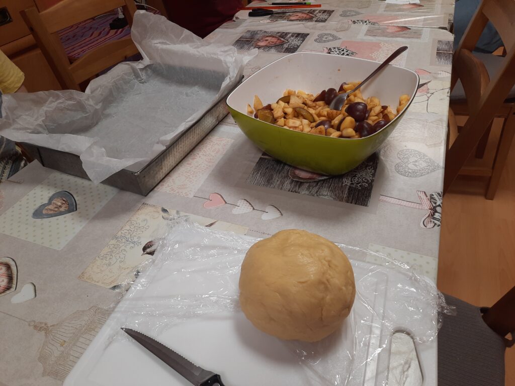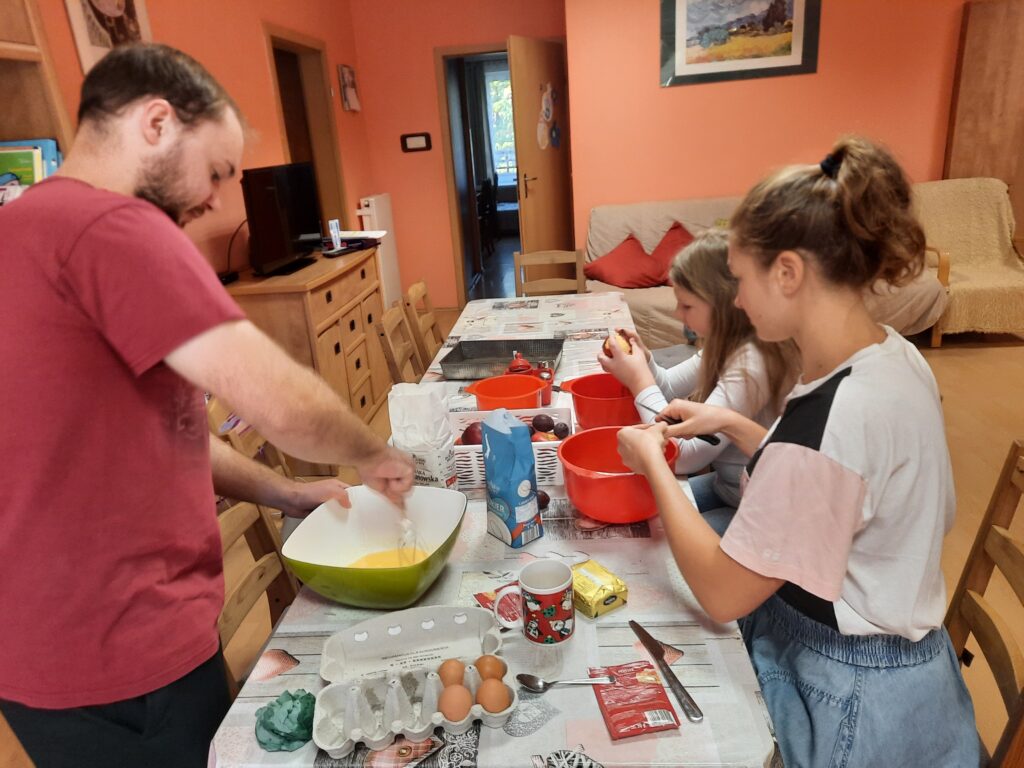 19 października w sobotę około południa wolontariusze p. Weronika i p. Rafał przyjechali do Internatu Dziewcząt. Razem z Kingą z grupy III, Anią z grupy V oraz Pauliną i Julią z grupy VI ciekawie spędzili czas. Ponieważ to była sobota a jak sobota to czas wolno płynie i na luzie. Wspólnie zadecydowaliśmy, że upieczemy jesienne ciasto ze śliwkami i jabłkami. Wolontariusz p. Rafał z entuzjazmem i męską siłą zajął się przygotowaniem ciasta. Dziewczyny z wolontariuszką p. Weroniką obierały owoce i kroiły na małe kawałki. Potem przyszła kolej na piekarnik. Nad odpowiednią temperaturą i czasem wypieku ciasta czuwała pani Asia. A w tym czasie miała miejsce emocjonująca gra w Taboo. Ale nie tak szybko. Oczywiście na początku wolontariusze zajęli się rozcięciem wydrukowanych i podpisanych w brailu i czarnodruku kart do gry. Później podzieliliśmy się na dwie drużyny A i B. Zasady były jasno określone a w trakcie gry nieco modyfikowane aby podnieść poprzeczkę uczestnikom. Gra praktycznie zakończyła się remisem w momencie, kiedy ciasto było już gotowe. A potem to już degustacja przy herbacie i miłej rozmowie. Poniżej fotorelacja.