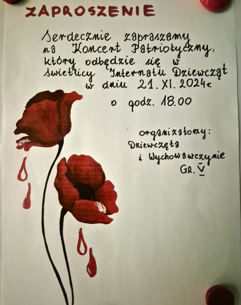 21 listopada w świetlicy Internatu Dziewcząt odbył się Koncert Patriotyczny przygotowany przez wychowawczynie panie Jolantę Krupę i Agatę Wiśniewską oraz dziewczęta z grupy V.