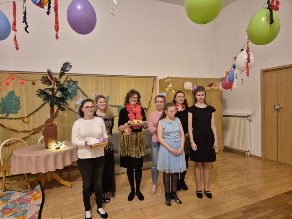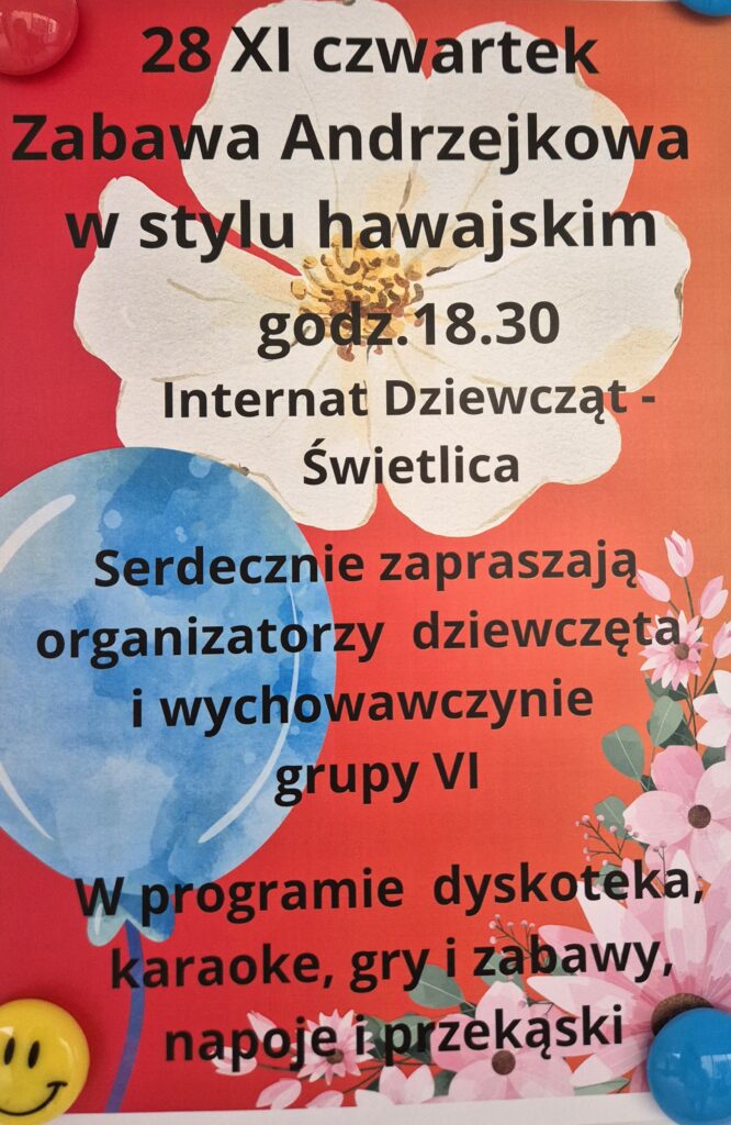 W ostatni czwartek listopada punktualnie o godzinie 18.30 rozpoczęła się w Internacie Dziewcząt Zabawa Andrzejkowa w stylu hawajskim zorganizowana przez wychowawczynie panie: Izę i Asię oraz dziewczęta z grupy 6.