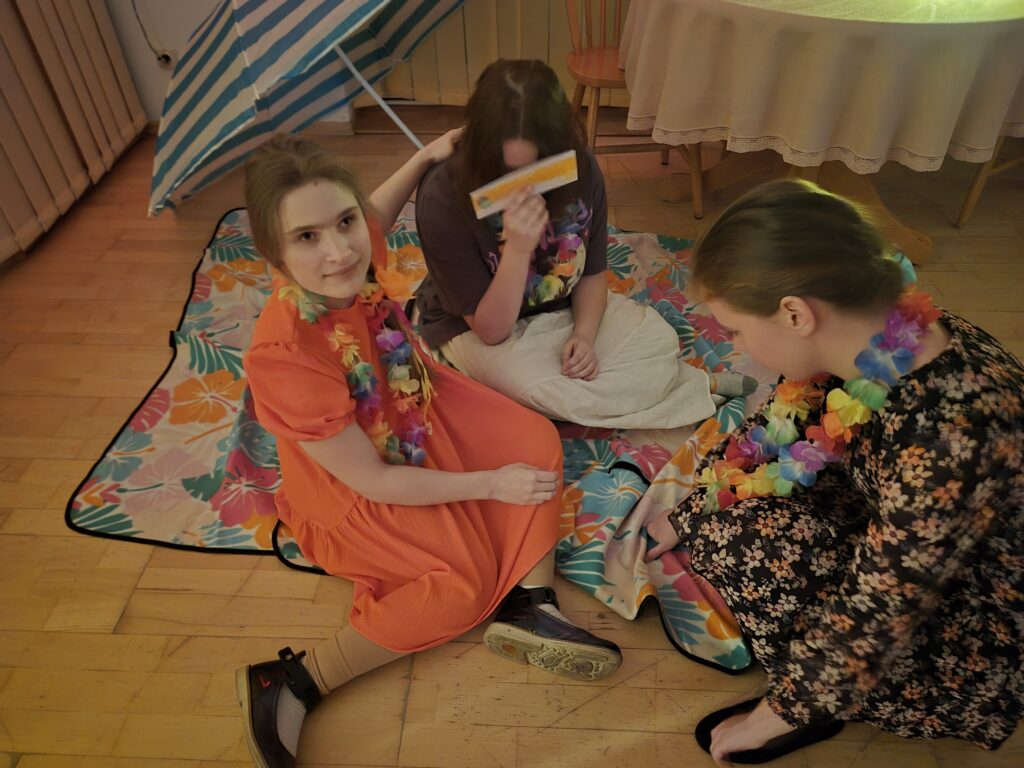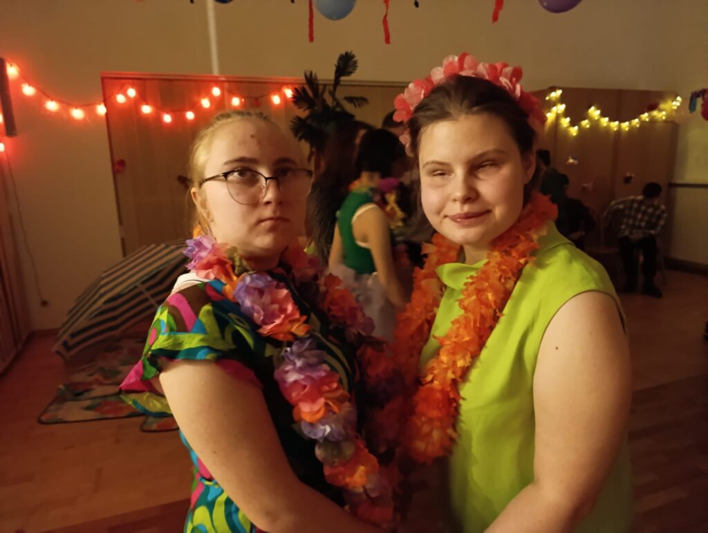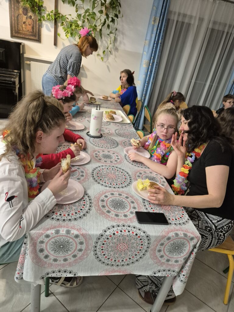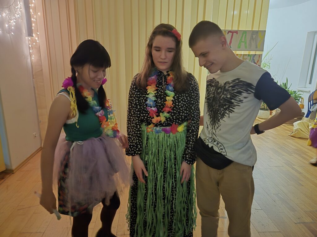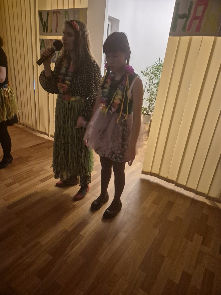 Ostatecznie na świetlicy zapanował iście hawajski klimat. Różnego rodzaju lampki, liście hawajskie, liany, palma, parasol i koce, na których można było zrelaksować się, dopełniały tego tropikalnego klimatu i oczywiście muzyka, nad którą czuwał nasz dźwiękowiec – Ewa Podlińska.