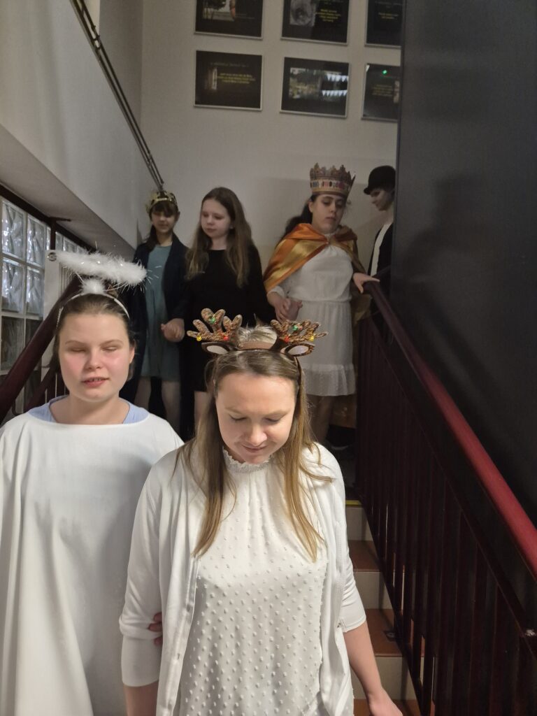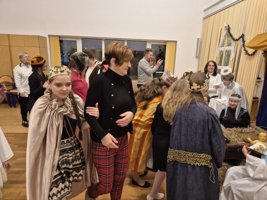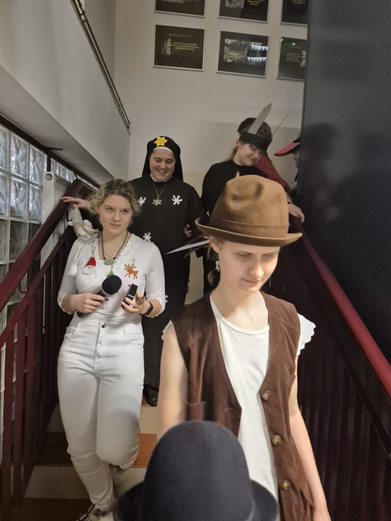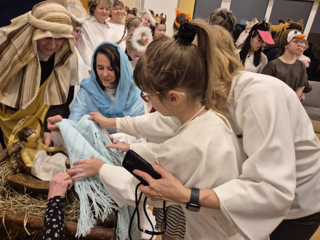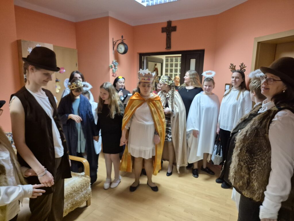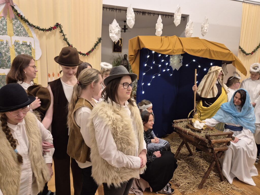 Następnie w barwny orszak włączyli się pastuszkowie (gr. VI) i wszelkie żywe stworzenia ( gr. V). Na końcu rozśpiewana grupa przyjęła jeszcze nasze najmłodsze mieszkanki internatu – gosposie – góraleczki i już w komplecie powędrowaliśmy na internatową świetlicę, która zamieniła się w betlejemską grotę – by tam z wielkim przejęciem pokłonić się świętej Rodzinie. Następnie dziewczęta z Rady Internatu pod kierunkiem p. Basi Kaiser zaprosiły nas na mini koncert świątecznych piosenek zwieńczony pastorałką z przesłaniem : „Niech gniew chory przemija: Glory, glory gloria!”. Następnie spotkaliśmy się na jadalni, gdzie ks. Marek pobłogosławił opłatki, którymi się podzieliliśmy, składając sobie świąteczne życzenia. Pyszna kolacja i śpiewanie kolęd, a nawet układanie własnych zwrotek – tak twórczo i radośnie spędziliśmy grudniowy wieczór.