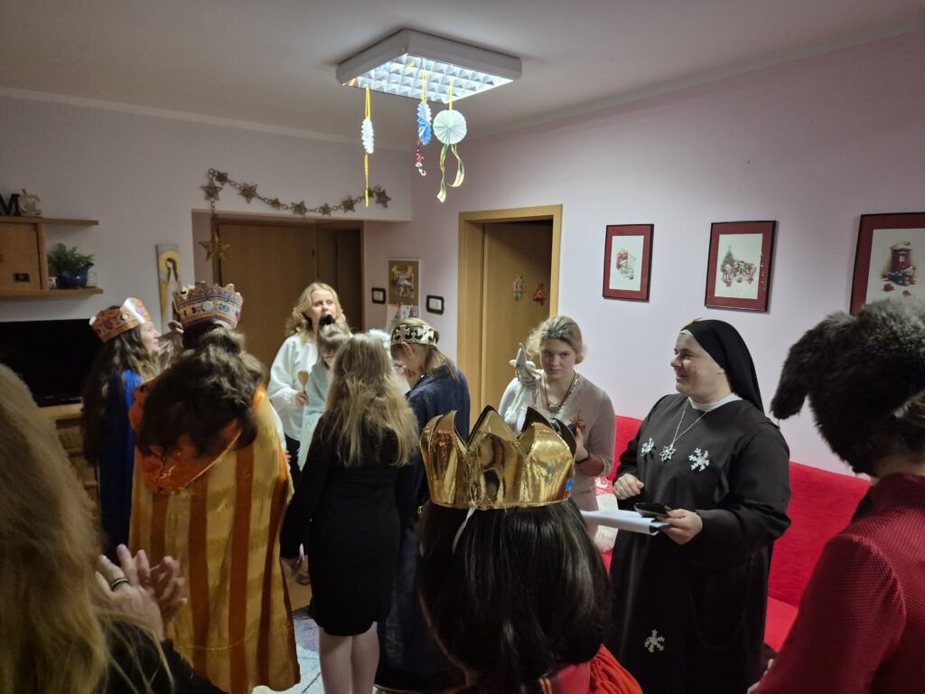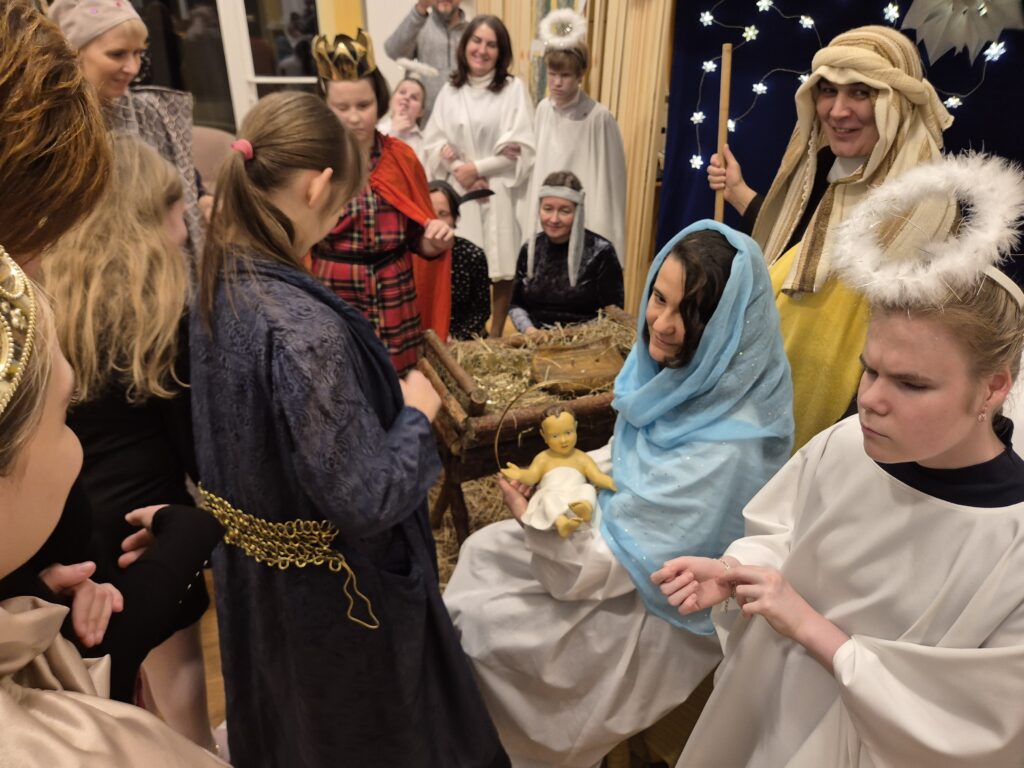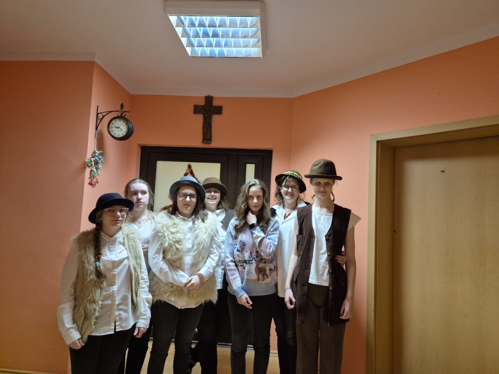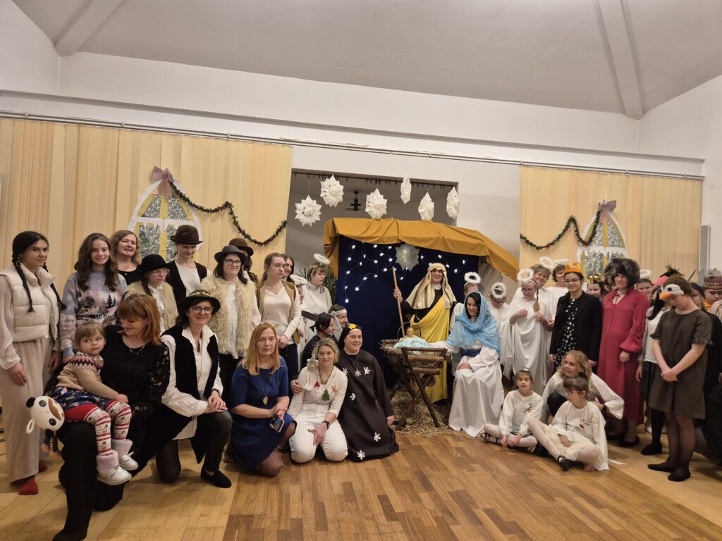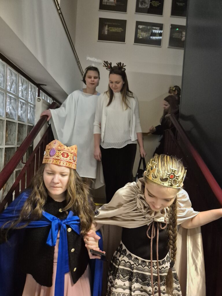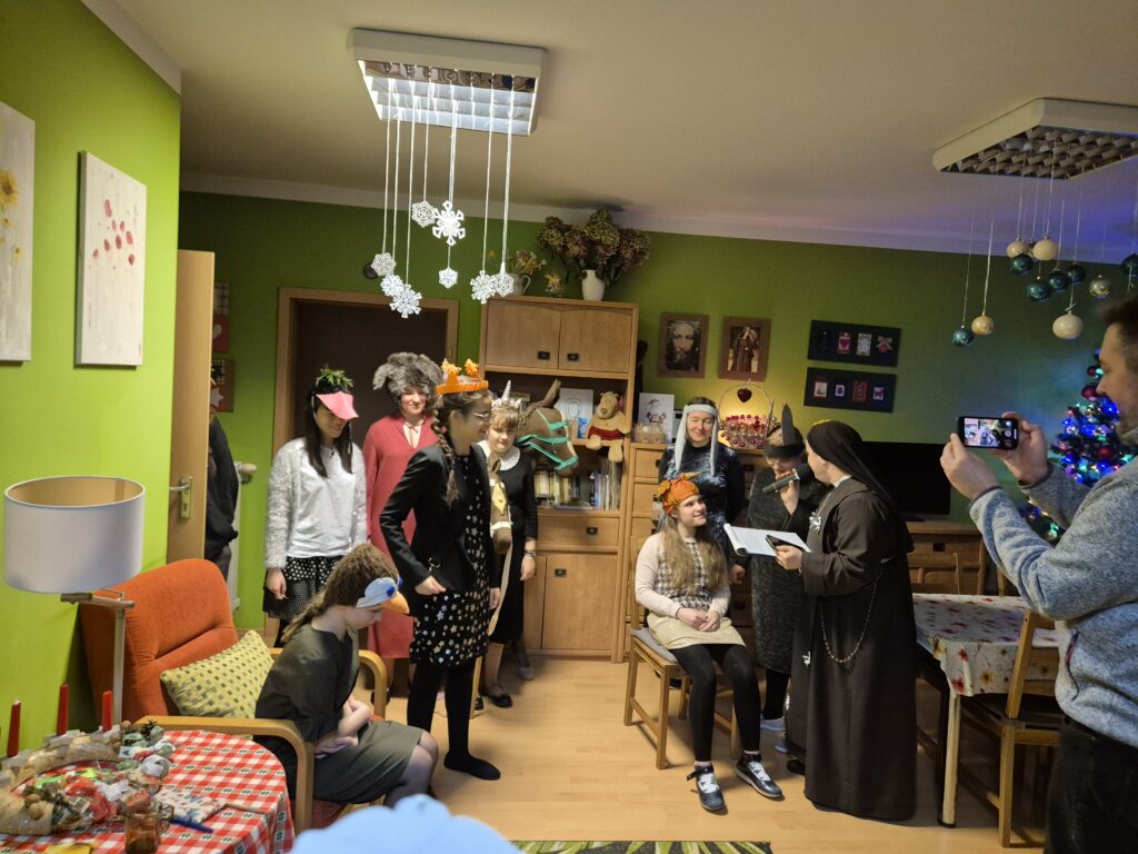 Następnie w barwny orszak włączyli się pastuszkowie (gr. VI) i wszelkie żywe stworzenia ( gr. V). Na końcu rozśpiewana grupa przyjęła jeszcze nasze najmłodsze mieszkanki internatu – gosposie – góraleczki i już w komplecie powędrowaliśmy na internatową świetlicę, która zamieniła się w betlejemską grotę – by tam z wielkim przejęciem pokłonić się świętej Rodzinie. Następnie dziewczęta z Rady Internatu pod kierunkiem p. Basi Kaiser zaprosiły nas na mini koncert świątecznych piosenek zwieńczony pastorałką z przesłaniem : „Niech gniew chory przemija: Glory, glory gloria!”. Następnie spotkaliśmy się na jadalni, gdzie ks. Marek pobłogosławił opłatki, którymi się podzieliliśmy, składając sobie świąteczne życzenia. Pyszna kolacja i śpiewanie kolęd, a nawet układanie własnych zwrotek – tak twórczo i radośnie spędziliśmy grudniowy wieczór.
