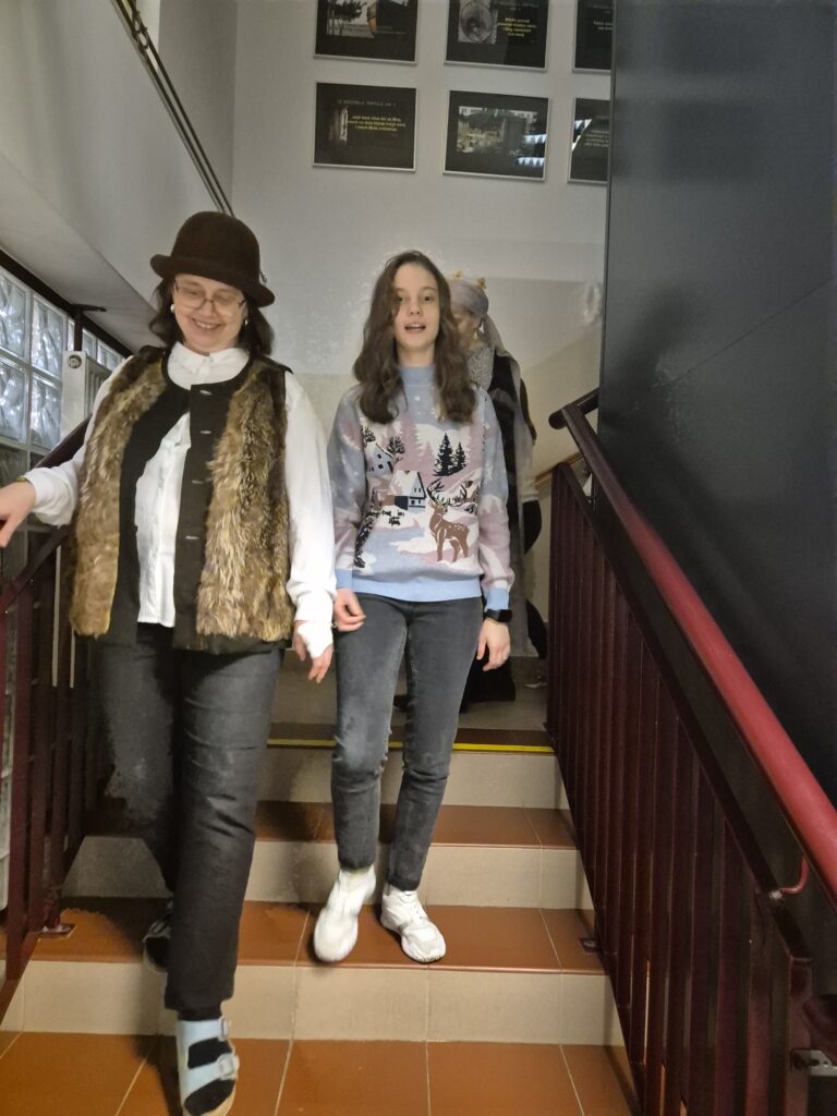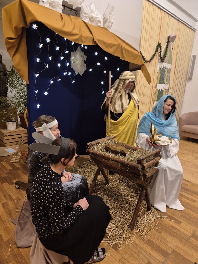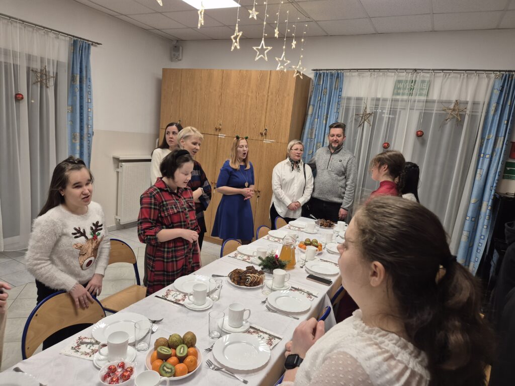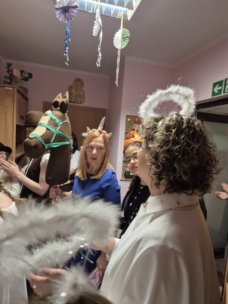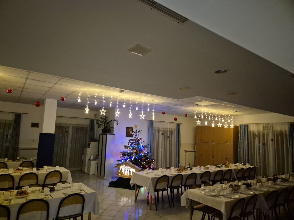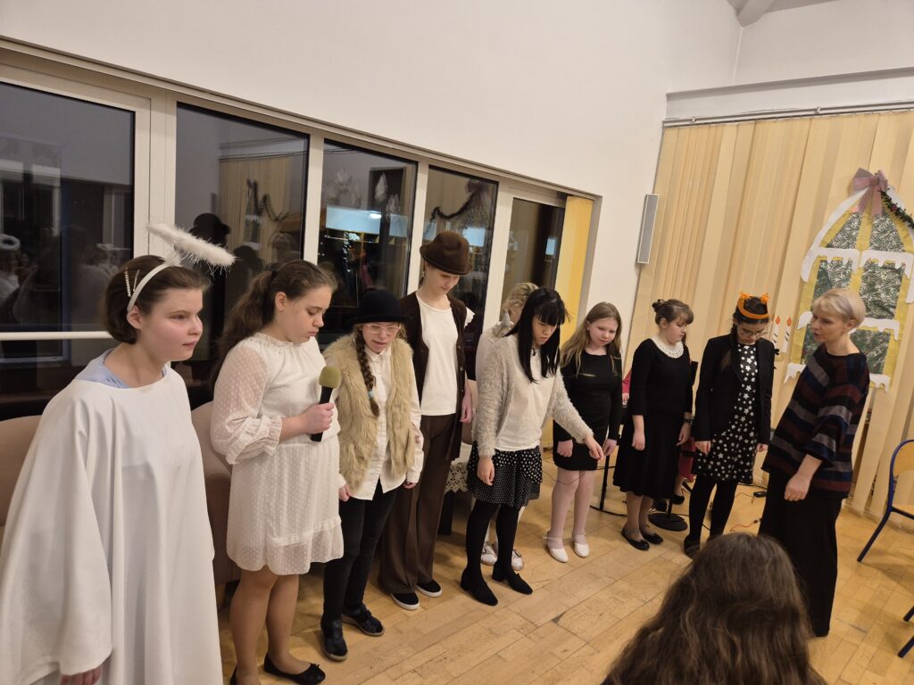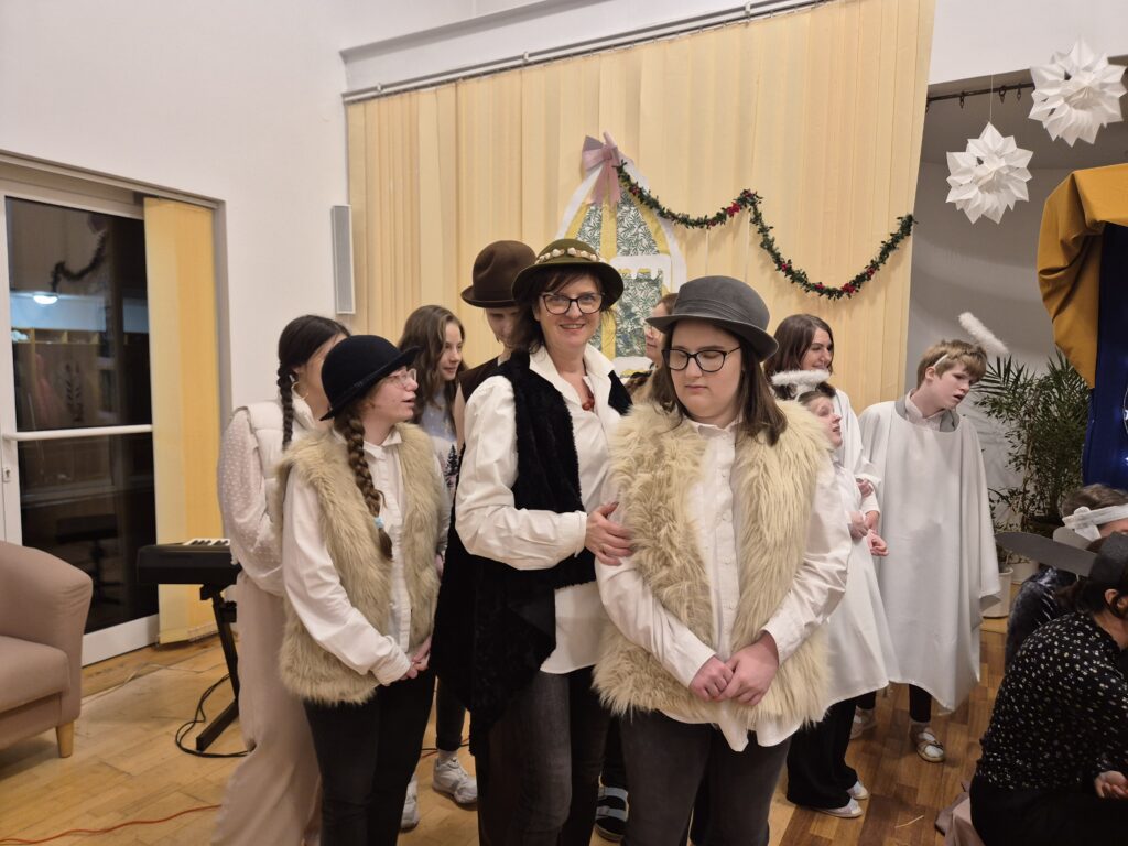 Następnie w barwny orszak włączyli się pastuszkowie (gr. VI) i wszelkie żywe stworzenia ( gr. V). Na końcu rozśpiewana grupa przyjęła jeszcze nasze najmłodsze mieszkanki internatu – gosposie – góraleczki i już w komplecie powędrowaliśmy na internatową świetlicę, która zamieniła się w betlejemską grotę – by tam z wielkim przejęciem pokłonić się świętej Rodzinie. Następnie dziewczęta z Rady Internatu pod kierunkiem p. Basi Kaiser zaprosiły nas na mini koncert świątecznych piosenek zwieńczony pastorałką z przesłaniem : „Niech gniew chory przemija: Glory, glory gloria!”. Następnie spotkaliśmy się na jadalni, gdzie ks. Marek pobłogosławił opłatki, którymi się podzieliliśmy, składając sobie świąteczne życzenia. Pyszna kolacja i śpiewanie kolęd, a nawet układanie własnych zwrotek – tak twórczo i radośnie spędziliśmy grudniowy wieczór.