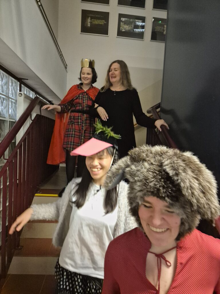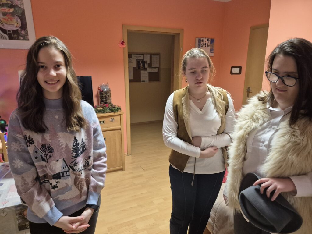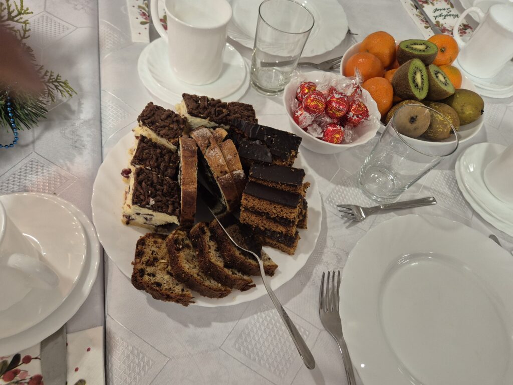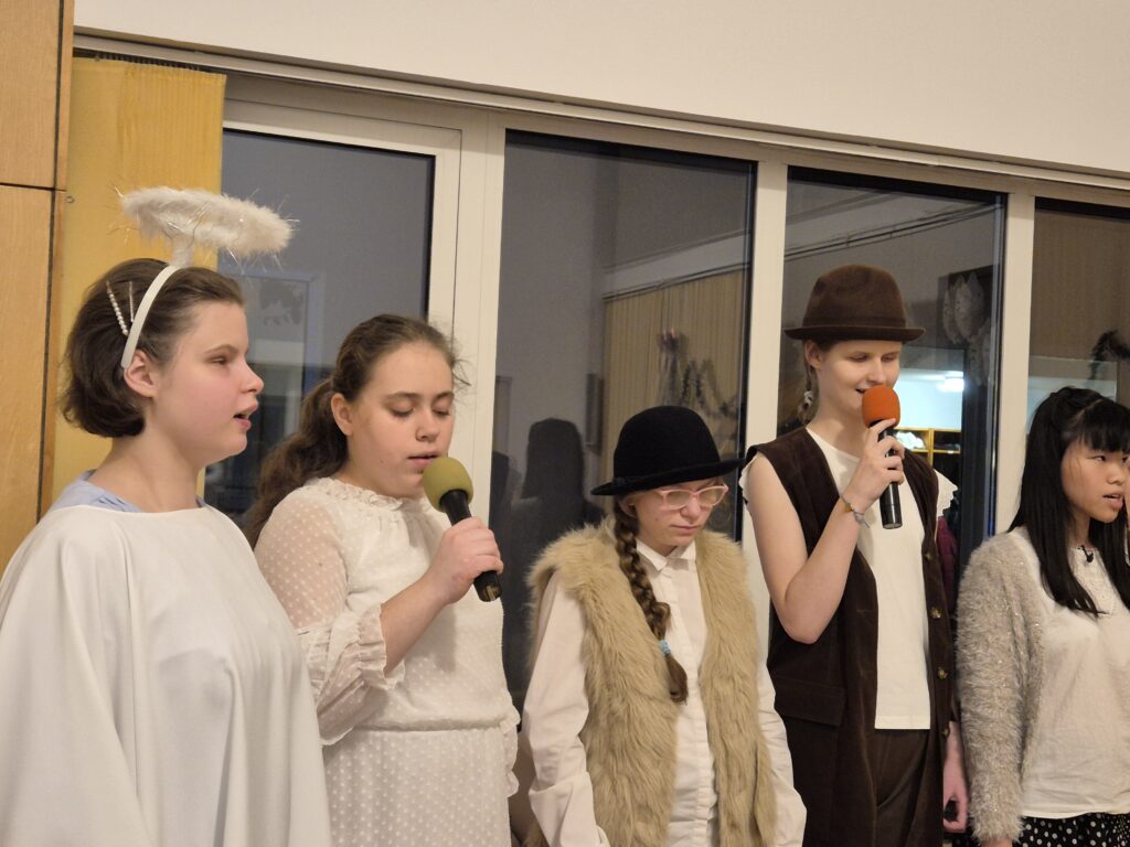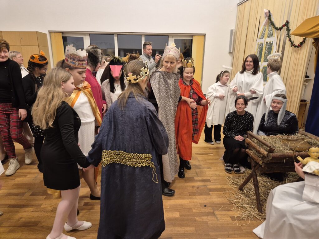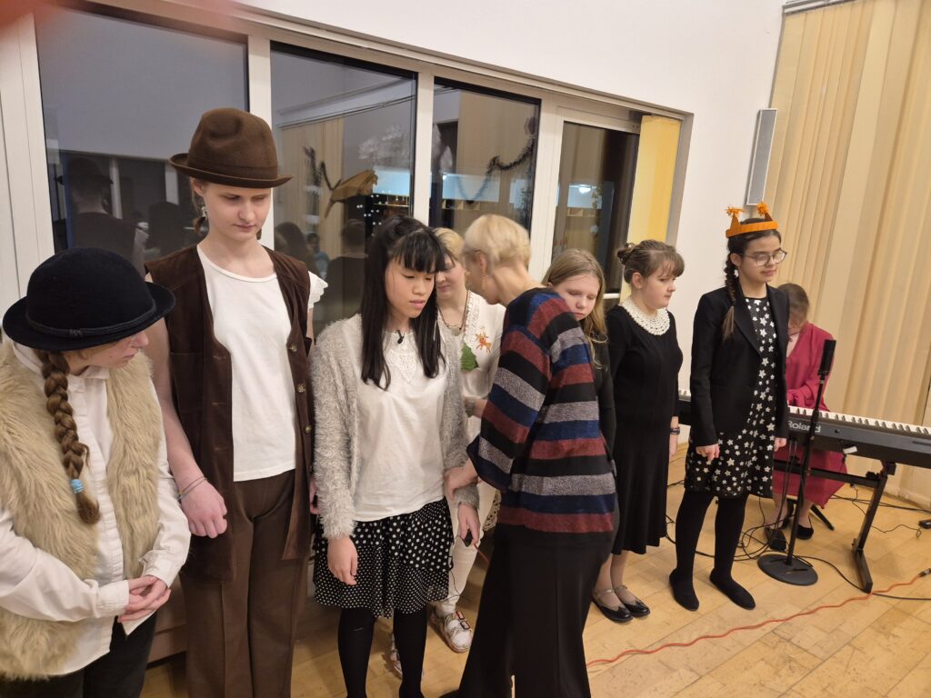 Następnie w barwny orszak włączyli się pastuszkowie (gr. VI) i wszelkie żywe stworzenia ( gr. V). Na końcu rozśpiewana grupa przyjęła jeszcze nasze najmłodsze mieszkanki internatu – gosposie – góraleczki i już w komplecie powędrowaliśmy na internatową świetlicę, która zamieniła się w betlejemską grotę – by tam z wielkim przejęciem pokłonić się świętej Rodzinie. Następnie dziewczęta z Rady Internatu pod kierunkiem p. Basi Kaiser zaprosiły nas na mini koncert świątecznych piosenek zwieńczony pastorałką z przesłaniem : „Niech gniew chory przemija: Glory, glory gloria!”. Następnie spotkaliśmy się na jadalni, gdzie ks. Marek pobłogosławił opłatki, którymi się podzieliliśmy, składając sobie świąteczne życzenia. Pyszna kolacja i śpiewanie kolęd, a nawet układanie własnych zwrotek – tak twórczo i radośnie spędziliśmy grudniowy wieczór.