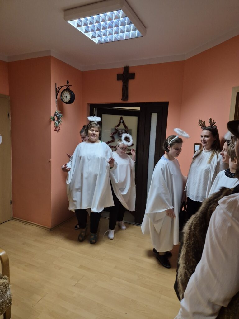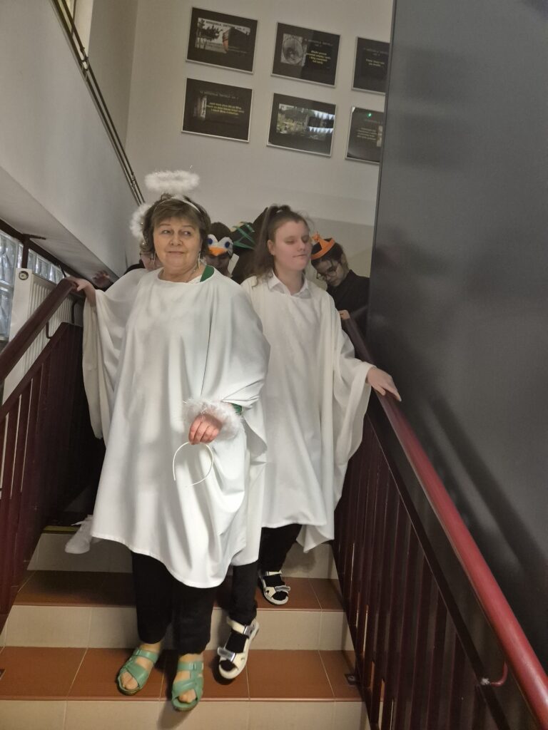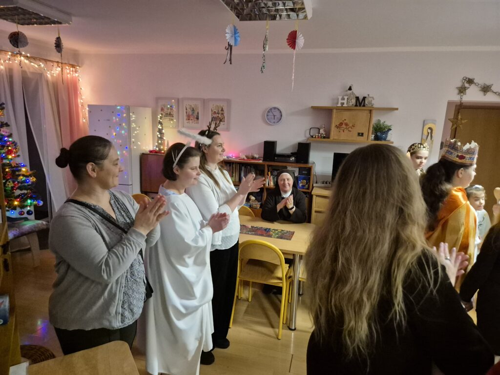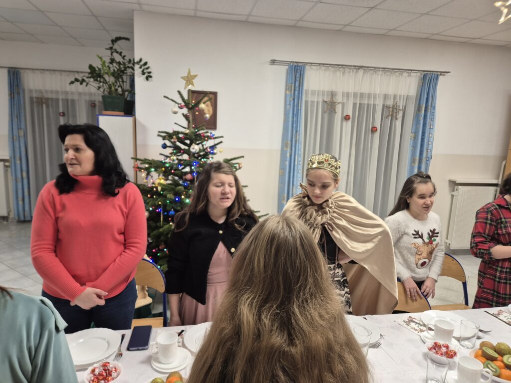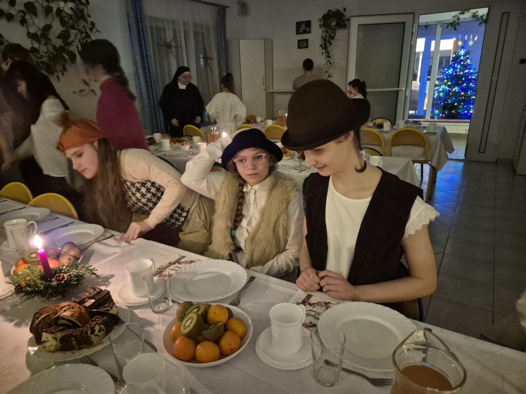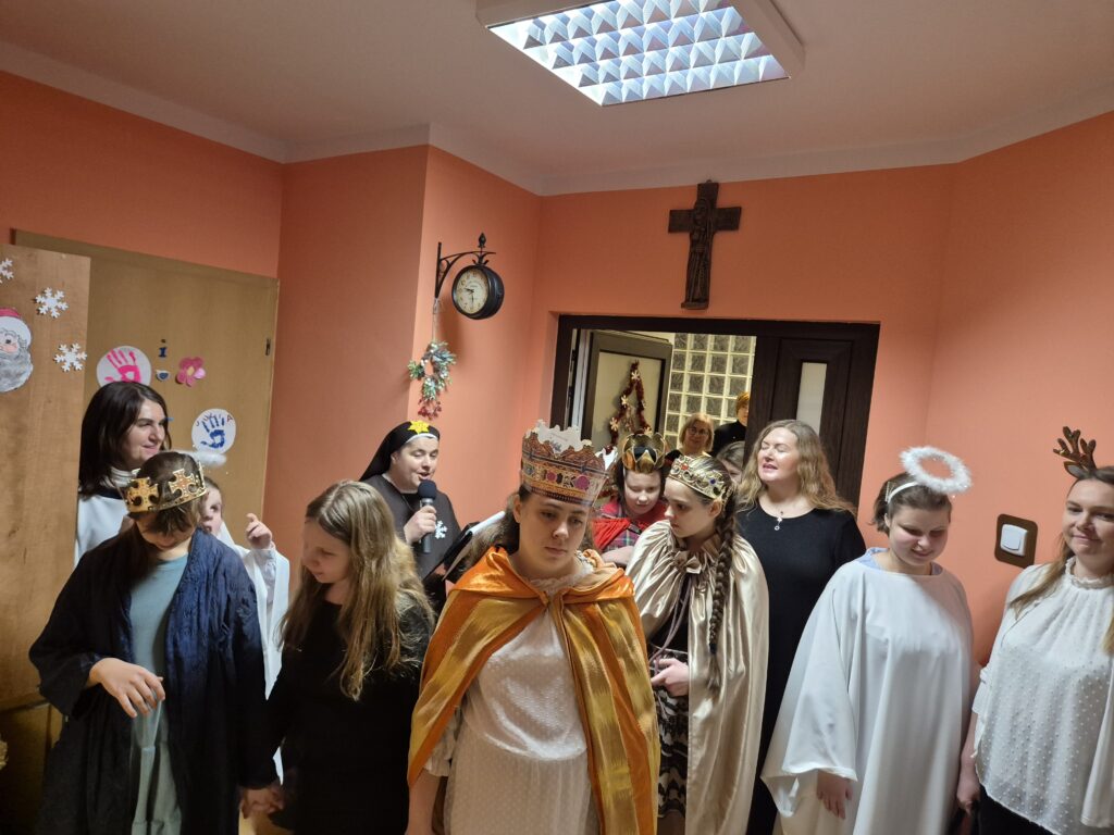Choinka oraz stajenka na jadalni Na jadalni przed spotkaniem opłatkowymSiostra Marta z JezuskiemPastuszkowie z grupy VIAniołowie wchodzą do grupy VIKrólowie i aniołowie przychodzą po pastuszkówPastuszkowie: Amelia, Julia i PaulinaSiostra Marta wraz z orszakiemPani Dorota i anioł MajaDziewczęta z grupy vIUczestnicy orszakuW grupie Vi wśród zwierzątekPastuszkowie podczas wędrówki do BetlejemCzas na królów Królowie, anioł i renifer w trakcie ciężkiej wędrówki po schodachKonstancja anioł z panią Anią reniferem a za nimi królowieSiostra Marta wraz z dziewczętami w trakcie orszakuPani Małgosia prowadzi Króla Julkę a przed nią dwa urocze zwierzaczkiAniłowie pani Dorota wraz z SandrąPanie Jola, Kasia, AsiaW grupie I orszak przywędrował po gospodynieW grupie IW grupie IW grupie IPastuszek i król w drodze do stajenkiKrólowie w drodze do stajenkiPani Małgosia i dziewczynkiSiostra Marta gwiazdeczka wraz z choineczką Ewą wita przybyłychŚwięta RodzinaAniołowie już w stajenceKrólowie oddają hołd dzieciątkuPani Ania wraz z królamiŚwięta Rodzina w gronie najbliższychMaryja wraz z Józefem i DzieciątkiemPastuszkowie przy stajencePastuszkowie przy stajenceDaryna okrywa Dzieciątko kołderkąMaryja tuli DzieciatkoGrupowe zdjęcie uczestników Wędrówki Występ dziewcząt z Rady InternatuDziewczęta w trakcie śpiewania kolęd Amina i Paulina w trakcie śpiewuKinga wraz z Aminą śpiewają kolędęW oczekiwaniu na spotkanie opłatkoweOla i ValeriaKsiądz Marek , Siostry Marta, Julita i wychowawczynie, dziewczynki tuż przed dzieleniem się opłatkiemGrupa III wraz z mamą OliwiiNa spotkaniu opłatkowymCiasta i owoceKrokiety i barszczykUroczysta kolacjaW trakcie kolacjiŚwiąteczny stroik