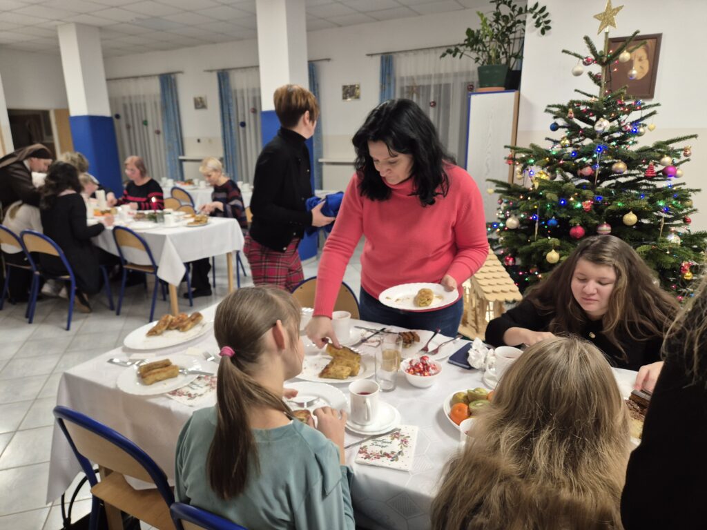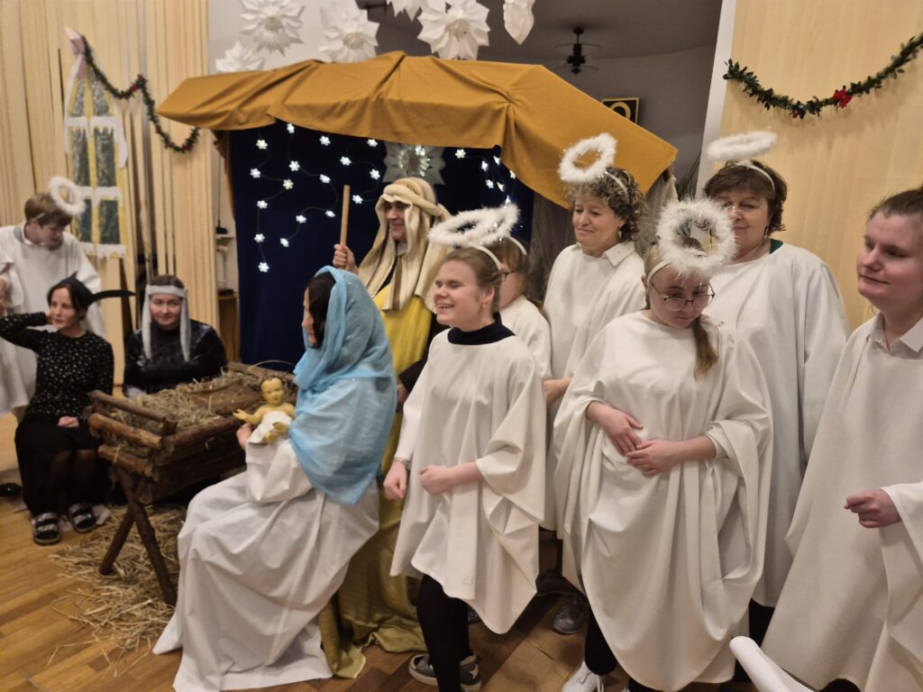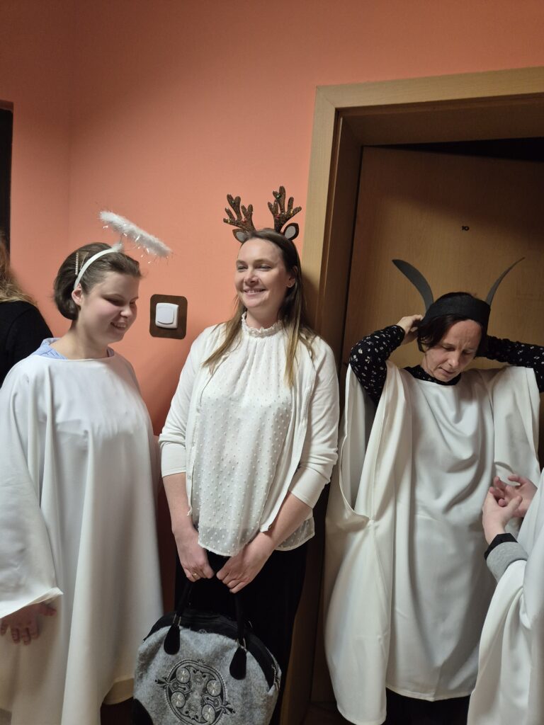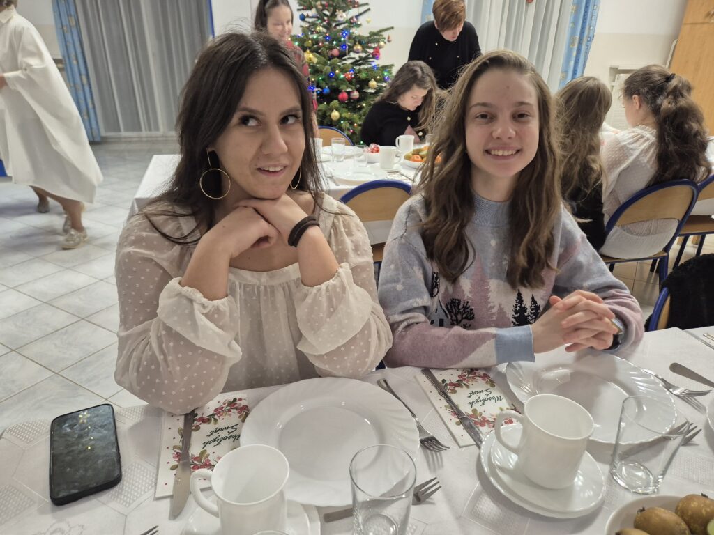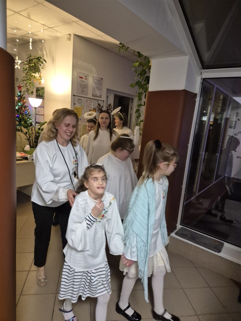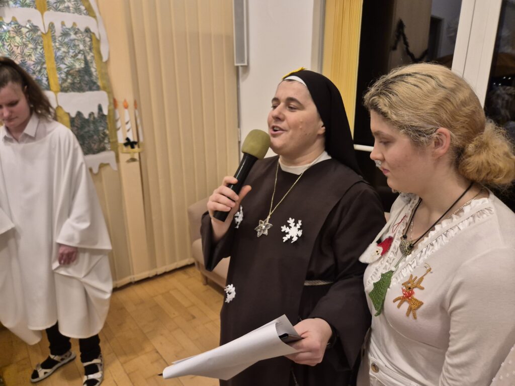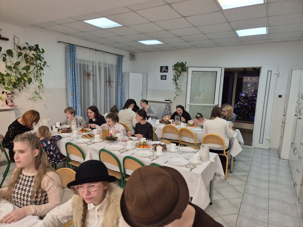 Choinka oraz stajenka na jadalni Na jadalni przed spotkaniem opłatkowymSiostra Marta z JezuskiemPastuszkowie z grupy VIAniołowie wchodzą do grupy VIKrólowie i aniołowie przychodzą po pastuszkówPastuszkowie: Amelia, Julia i PaulinaSiostra Marta wraz z orszakiemPani Dorota i anioł MajaDziewczęta z grupy vIUczestnicy orszakuW grupie Vi wśród zwierzątekPastuszkowie podczas wędrówki do BetlejemCzas na królów Królowie, anioł i renifer w trakcie ciężkiej wędrówki po schodachKonstancja anioł z panią Anią reniferem a za nimi królowieSiostra Marta wraz z dziewczętami w trakcie orszakuPani Małgosia prowadzi Króla Julkę a przed nią dwa urocze zwierzaczkiAniłowie pani Dorota wraz z SandrąPanie Jola, Kasia, AsiaW grupie I orszak przywędrował po gospodynieW grupie IW grupie IW grupie IPastuszek i król w drodze do stajenkiKrólowie w drodze do stajenkiPani Małgosia i dziewczynkiSiostra Marta gwiazdeczka wraz z choineczką Ewą wita przybyłychŚwięta RodzinaAniołowie już w stajenceKrólowie oddają hołd dzieciątkuPani Ania wraz z królamiŚwięta Rodzina w gronie najbliższychMaryja wraz z Józefem i DzieciątkiemPastuszkowie przy stajencePastuszkowie przy stajenceDaryna okrywa Dzieciątko kołderkąMaryja tuli DzieciatkoGrupowe zdjęcie uczestników Wędrówki Występ dziewcząt z Rady InternatuDziewczęta w trakcie śpiewania kolęd Amina i Paulina w trakcie śpiewuKinga wraz z Aminą śpiewają kolędęW oczekiwaniu na spotkanie opłatkoweOla i ValeriaKsiądz Marek , Siostry Marta, Julita i wychowawczynie, dziewczynki tuż przed dzieleniem się opłatkiemGrupa III wraz z mamą OliwiiNa spotkaniu opłatkowymCiasta i owoceKrokiety i barszczykUroczysta kolacjaW trakcie kolacjiŚwiąteczny stroik