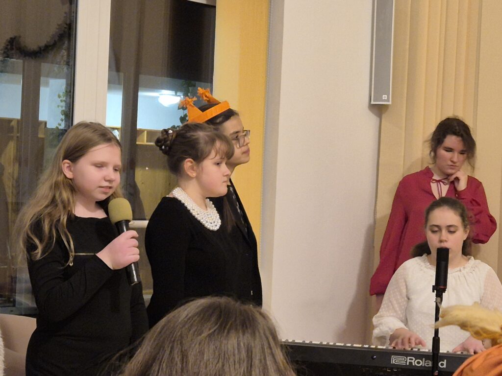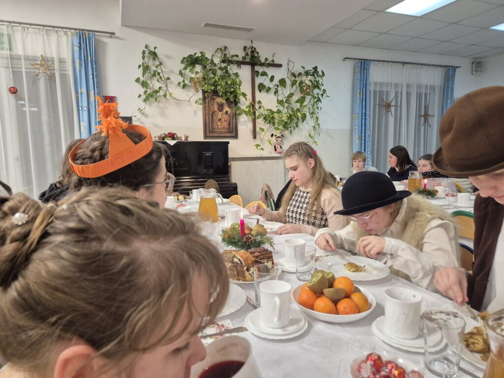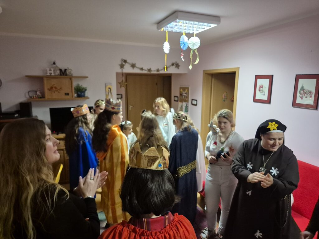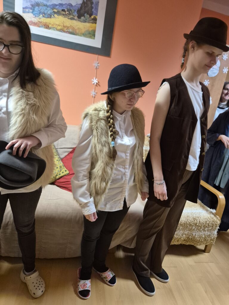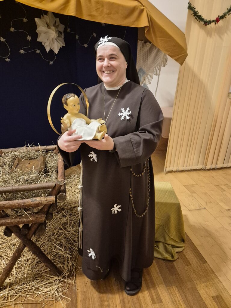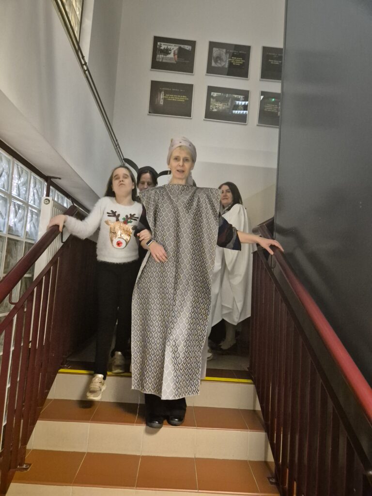 Choinka oraz stajenka na jadalni Na jadalni przed spotkaniem opłatkowymSiostra Marta z JezuskiemPastuszkowie z grupy VIAniołowie wchodzą do grupy VIKrólowie i aniołowie przychodzą po pastuszkówPastuszkowie: Amelia, Julia i PaulinaSiostra Marta wraz z orszakiemPani Dorota i anioł MajaDziewczęta z grupy vIUczestnicy orszakuW grupie Vi wśród zwierzątekPastuszkowie podczas wędrówki do BetlejemCzas na królów Królowie, anioł i renifer w trakcie ciężkiej wędrówki po schodachKonstancja anioł z panią Anią reniferem a za nimi królowieSiostra Marta wraz z dziewczętami w trakcie orszakuPani Małgosia prowadzi Króla Julkę a przed nią dwa urocze zwierzaczkiAniłowie pani Dorota wraz z SandrąPanie Jola, Kasia, AsiaW grupie I orszak przywędrował po gospodynieW grupie IW grupie IW grupie IPastuszek i król w drodze do stajenkiKrólowie w drodze do stajenkiPani Małgosia i dziewczynkiSiostra Marta gwiazdeczka wraz z choineczką Ewą wita przybyłychŚwięta RodzinaAniołowie już w stajenceKrólowie oddają hołd dzieciątkuPani Ania wraz z królamiŚwięta Rodzina w gronie najbliższychMaryja wraz z Józefem i DzieciątkiemPastuszkowie przy stajencePastuszkowie przy stajenceDaryna okrywa Dzieciątko kołderkąMaryja tuli DzieciatkoGrupowe zdjęcie uczestników Wędrówki Występ dziewcząt z Rady InternatuDziewczęta w trakcie śpiewania kolęd Amina i Paulina w trakcie śpiewuKinga wraz z Aminą śpiewają kolędęW oczekiwaniu na spotkanie opłatkoweOla i ValeriaKsiądz Marek , Siostry Marta, Julita i wychowawczynie, dziewczynki tuż przed dzieleniem się opłatkiemGrupa III wraz z mamą OliwiiNa spotkaniu opłatkowymCiasta i owoceKrokiety i barszczykUroczysta kolacjaW trakcie kolacjiŚwiąteczny stroik