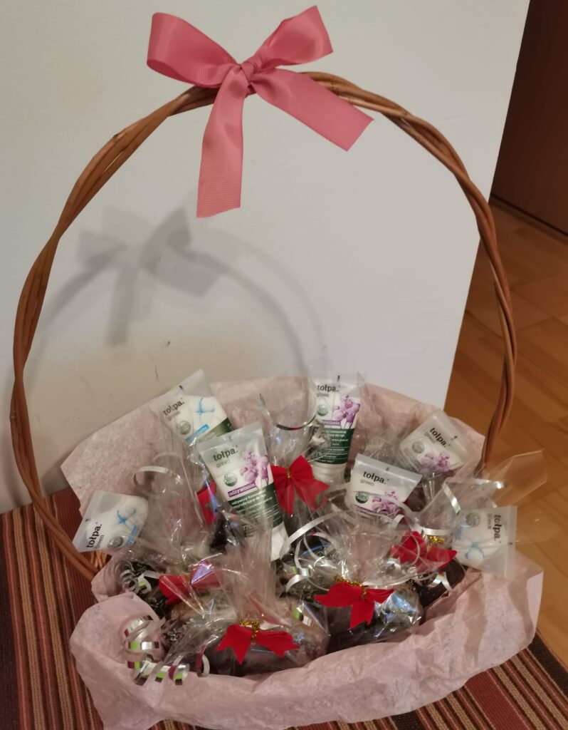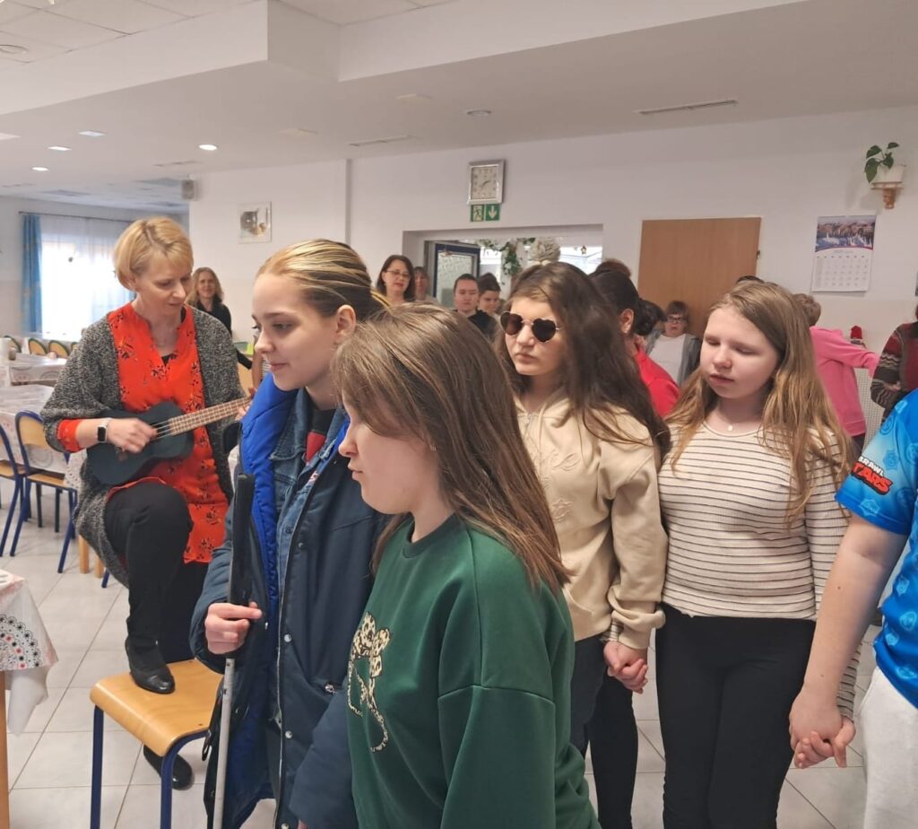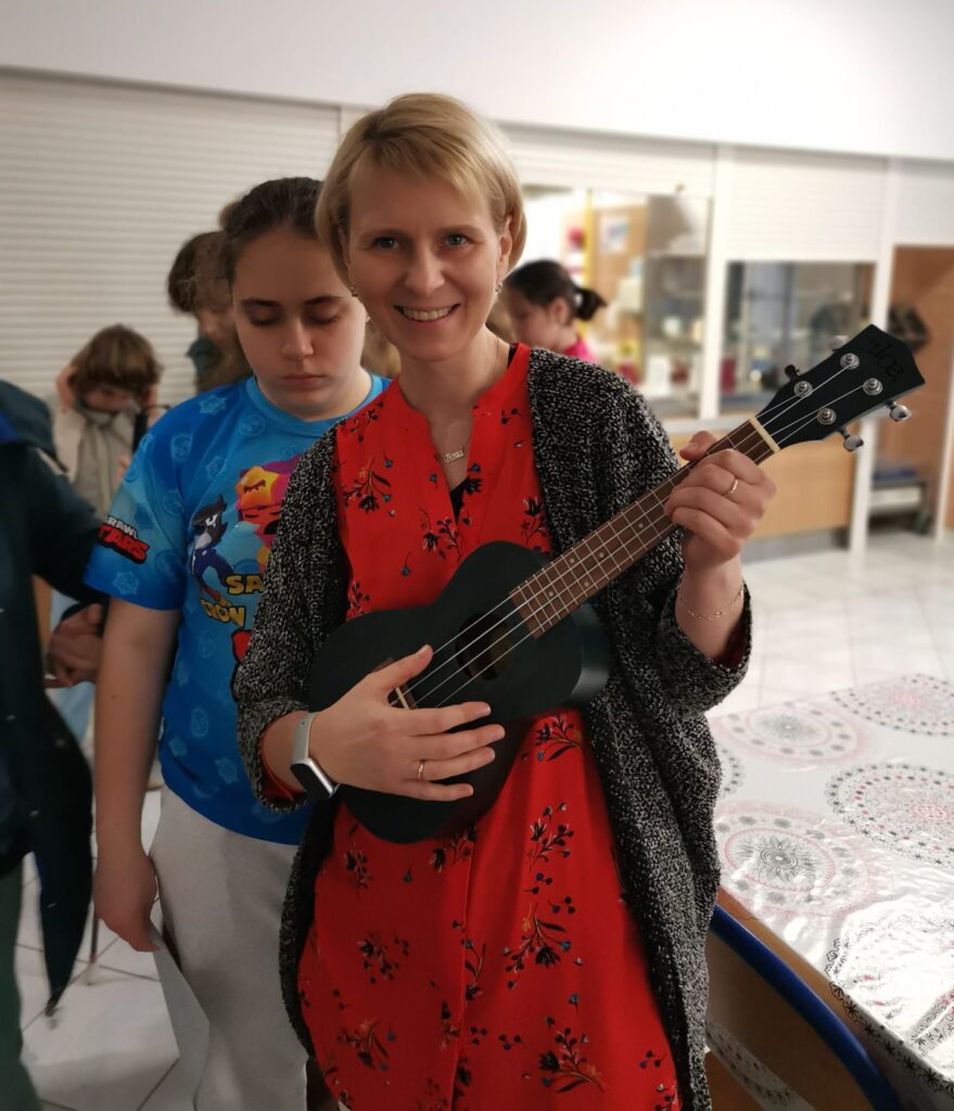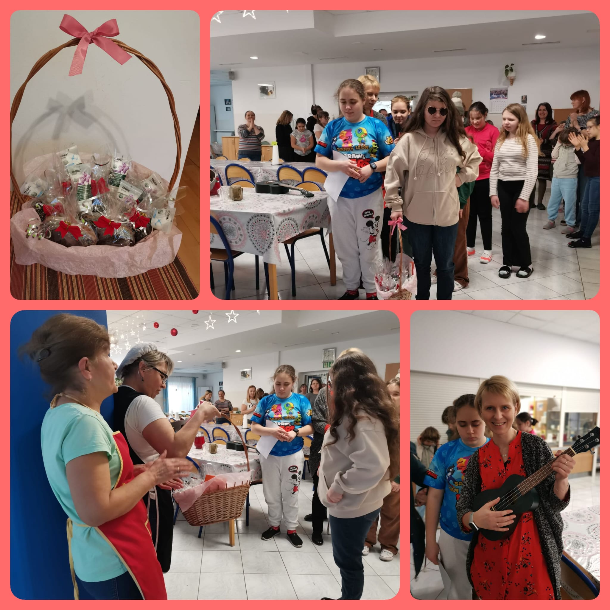 Nie zabrakło również imieninowej piosenki: ” Życzymy, życzymy…” do której na ukulele przygrywała p. Basia. Na koniec dziewczyny wręczyły Paniom kosz z własnoręcznie przygotowanym piernikami w kształcie serca.