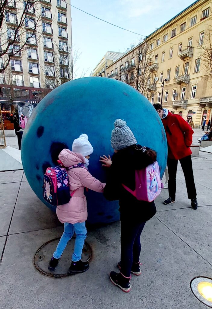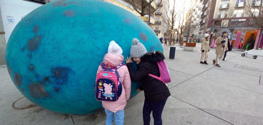 Jest to szczególne, dwumetrowe, niebieskie jajo, które kryje akustyczną niespodziankę… Gdy ktoś przytula się do rzeźby, w jaju uruchamia się mechanizm imitujący stukanie w skorupkę, przez wykluwające się pisklę drozda śpiewaka. Dziewczynkom spodobała się ta interaktywna instalacja, było to dla nich niesamowite doświadczenie, usłyszeć odgłosy pisklęcia w środku miasta.
