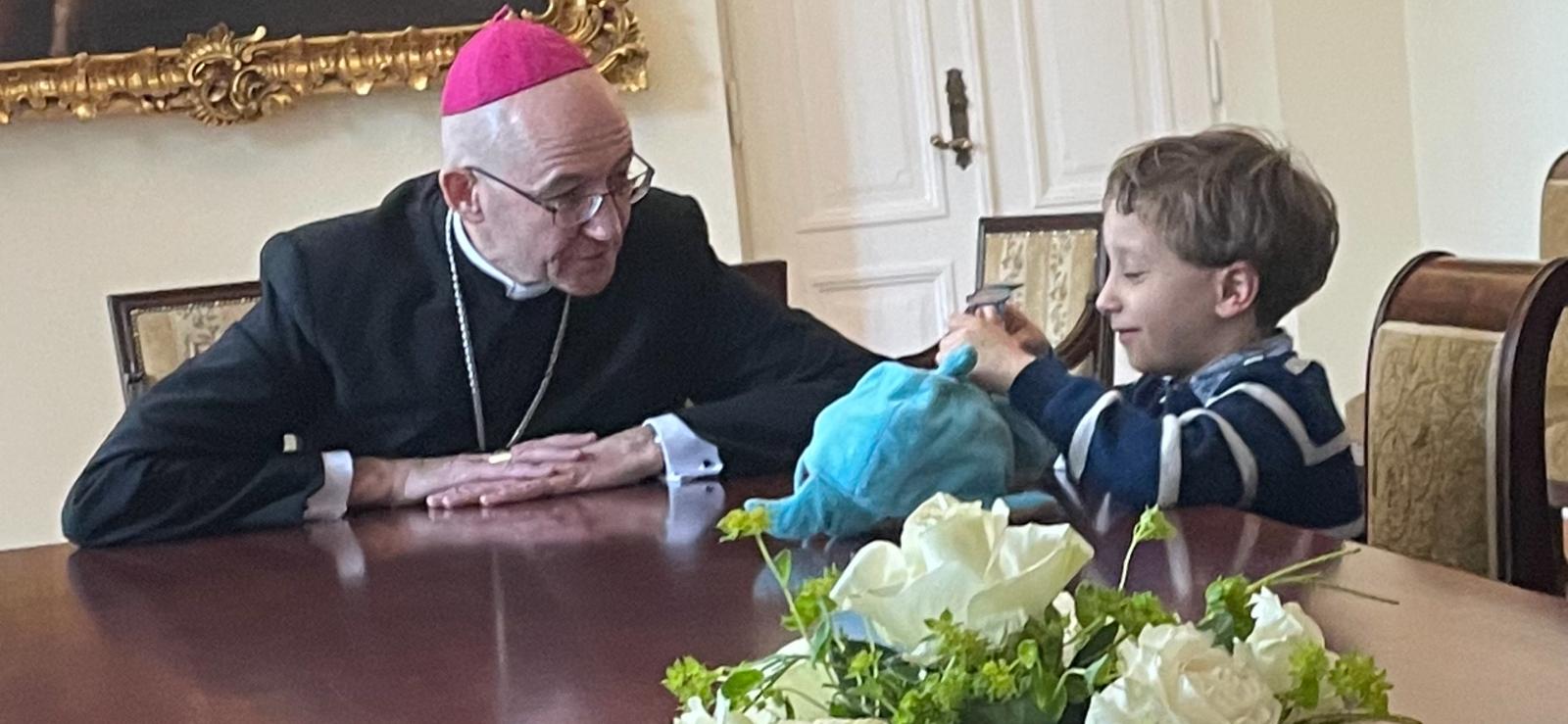 Delegacja naszych przedszkolaków złożyła serdeczne życzenia , drogiemu solenizantowi abp. Adrianowi Galbasowi , ofiarując dziecięcą radość i drobne własnoręcznie wykonane upominki.