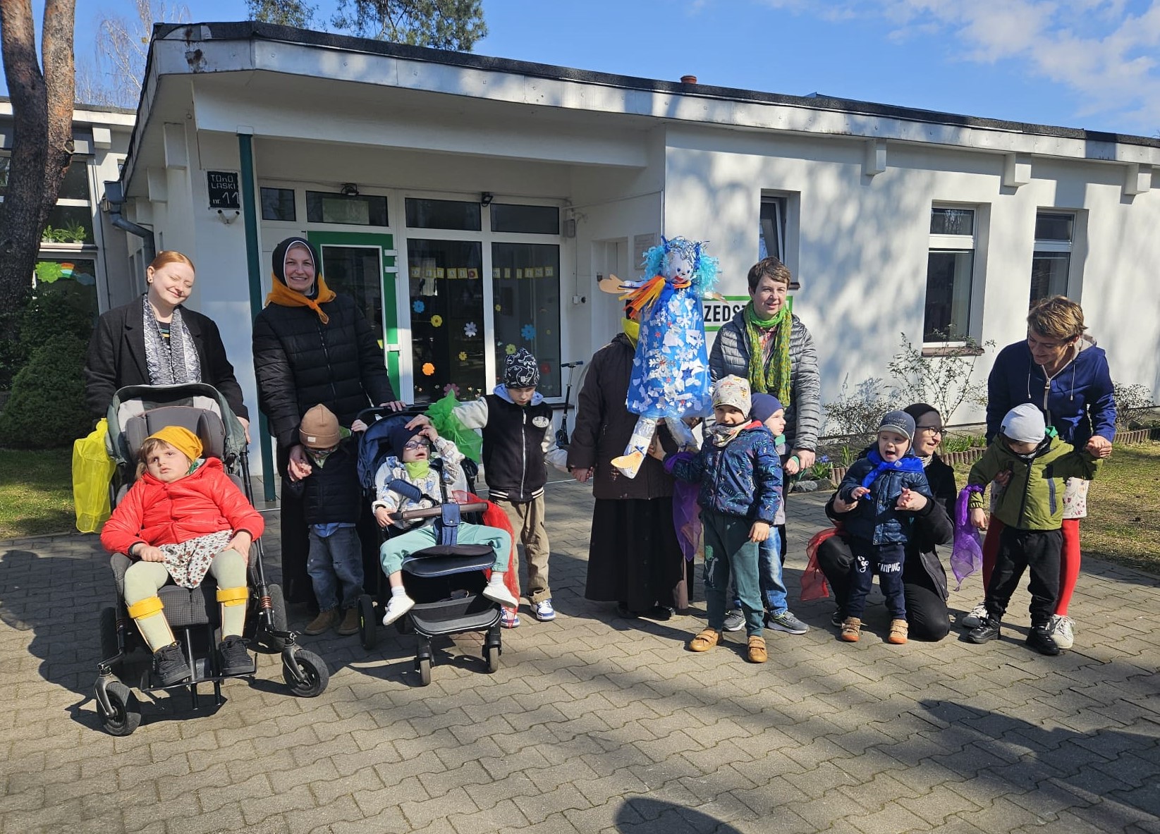 Nasze przedszkolaki jak wszystkie dzieci uwielbiają śnieżne bałwanki i lodowe ślizgawki, ale wszystko ma swój czas. Dziś pierwszy dzień wiosny, więc pożegnaliśmy Panią Zimę piosenką: „Wsiadaj zimo na sanki i uciekaj już”. Dobrze wspominając zimowe zabawy, chcieliśmy jednak znaleźć dla niej nowy dom na ciepłe miesiące, aby wróciła kiedyś do nas. Okazało się to nie lada trudnym zadaniem. Odwiedziliśmy Dom Dziewcząt, Dział Lekarski, Kuchnię Centralną, Dział Księgowy, Biuro Zarządu i Biuro Szkolne. Pytaliśmy wszystkich napotkanych na laskowskich ścieżkach pracowników i spacerowiczów. Niestety nikt nie chciał już zimy. Wszyscy pytali o wiosnę. W końcu zmęczeni i zmartwieni bezowocnym wędrowaniem, spotkaliśmy tę jedną osobę, która zgodziła się przygarnąć naszą piękną Panią Zimę.