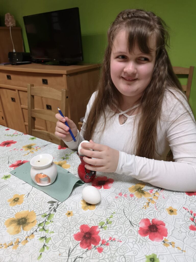 Dwa wieczory 12 i 13 kwietnia w  grupie 5 Internatu Dziewcząt  wypełniły się tradycją malowania kolorami jajek, pisania woskiem pisanek… Jak do tego doszło? Chęć młodych osób poznawania w doświadczaniu, zainteresowania wychowawczyni i zbliżające się Święta Wielkanocne stały się inspiracją tego wydarzenia. Zaczęło się od gotowania jaj na twardo, przygotowania narzędzi do rozgrzania wosku i pisania. I potem cierpliwie, ale i z radością stawianie pierwszych kropek, pisanie kresek i kreowanie autorskich pomysłów woskiem na skorupce jajka. „Taki wieczór to ja rozumiem…” – cytat z wypowiedzi wychowanki w trakcie pracy. Następnie nastąpiło przygotowanie farb w kolorach pomarańczowym, czerwonym, zielonym, niebieskim i fioletowym. Wybieranie ulubionych kolorów… Nasze Dziewczęta też mają ulubione kolory. Barwniki wydobyły woskowe pisanie. Radość doświadczania i tworzenia, wspólnej, chociaż indywidualizowanej pracy była obecna przez cały ten czas.