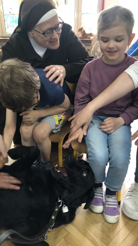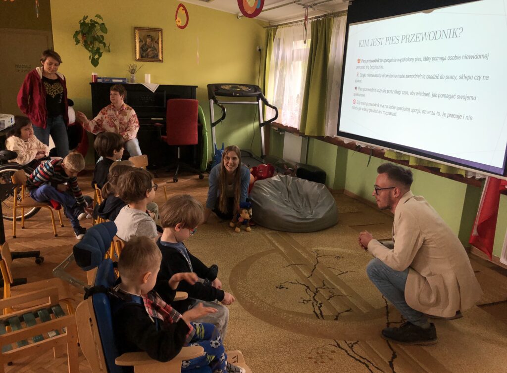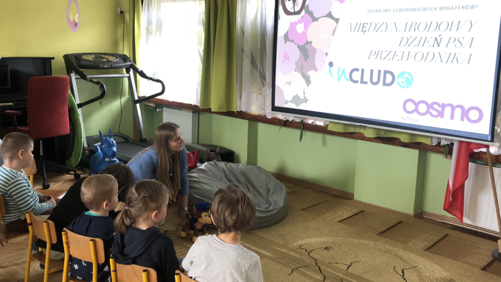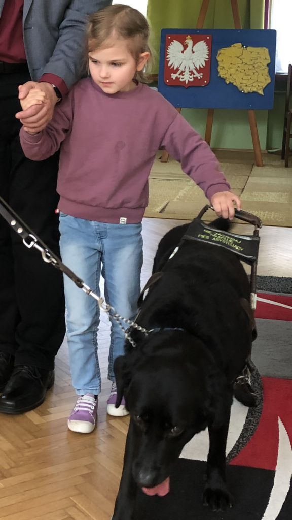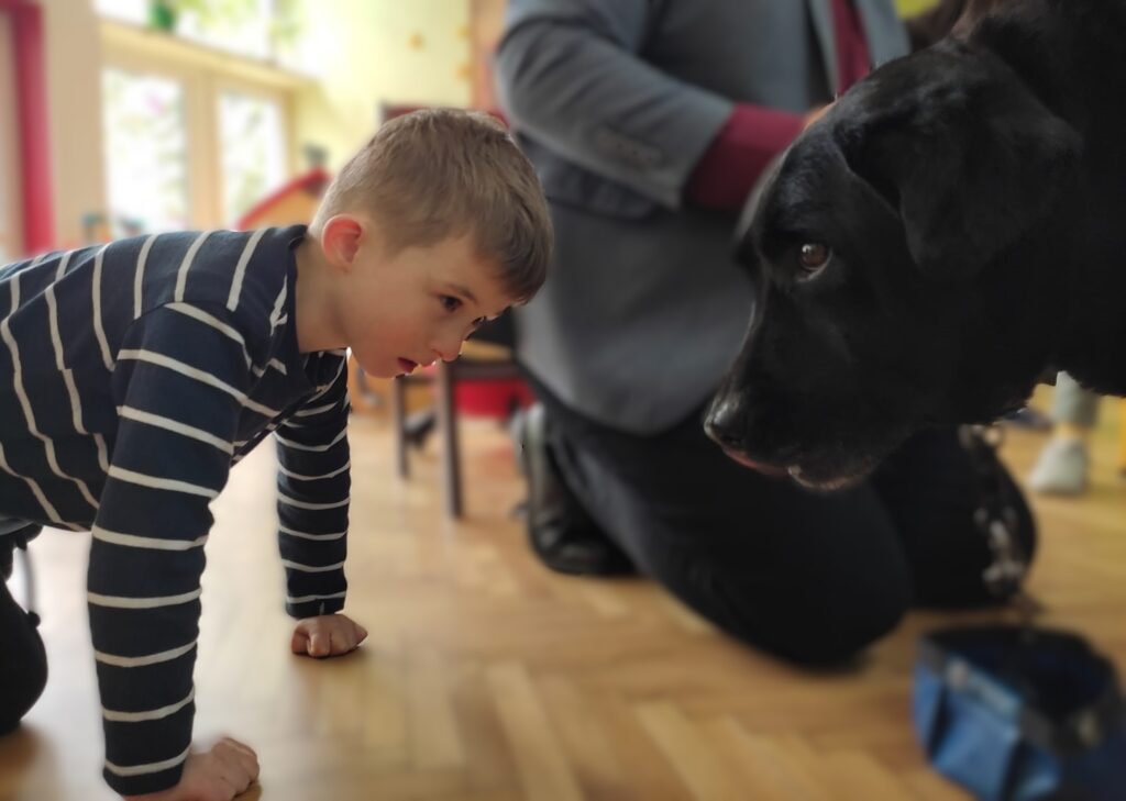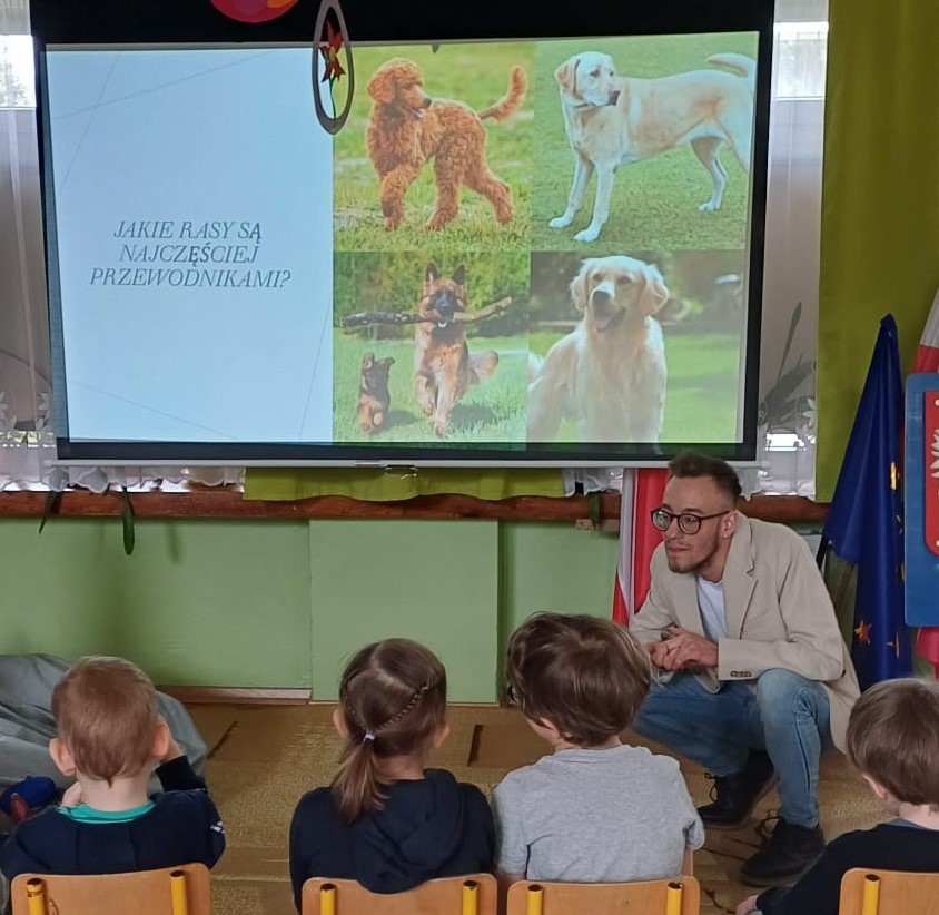Bohaterskie psy nieodmiennie kojarzą się każdemu dziecku z bajką Psi Patrol. Nasze przedszkolaki poznały nowego animowanego psiego bohatera i jest nim Pip, pies przewodnik osoby niewidomej. Z okazji Międzynarodowego Dnia Psa Przewodnika Pani Ola i Pan Dawid z zaprzyjaźnionej z nami firmy Includo pokazali nam bajkę oraz opowiedzieli historię małego biszkoptowego labradora, który aby zostać psem przewodnikiem, musiał przejść trudne szkolenie, nauczyć się obserwować dokładnie otoczenie, omijać przeszkody, zatrzymywać się na krawężniku, znajdować schody i drzwi, a na koniec zdać prawdziwy egzamin.