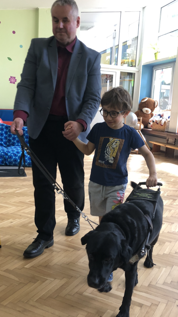 Na drugi dzień do przedszkola przyjechał kolejny gość – Pan Paweł ze swoim psem przewodnikiem Rege. To było bardzo interesujące spotkanie, podczas którego każdy chętny przedszkolak mógł spróbować jak pies przewodnik prowadzi osobę niewidomą. Te psy są naprawdę bardzo mądre, odważne, a do tego bardzo przyjacielskie. Pamiętajcie jednak, gdy pies przewodnik pracuje i prowadzi osobę niewidomą to nie wolno go zaczepiać! Zabawa tylko po pracy!