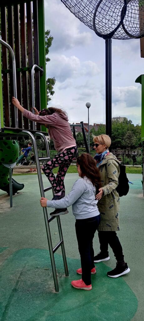 Po drodze odwiedziłyśmy ,,Stawy Brustmana”, gdzie dziewczęta wyszalały się na fantastycznym placu zabaw. Plac zabaw nosi nazwę „Proszę słonia”. Majki dowiedziały się, że symbolem dzielnicy Bielany jest słoń i poznały historie pierwszego „Bielańskiego Słonia”.
