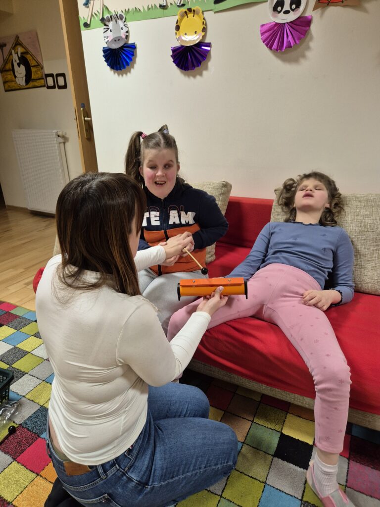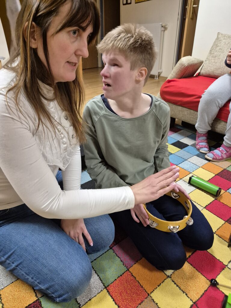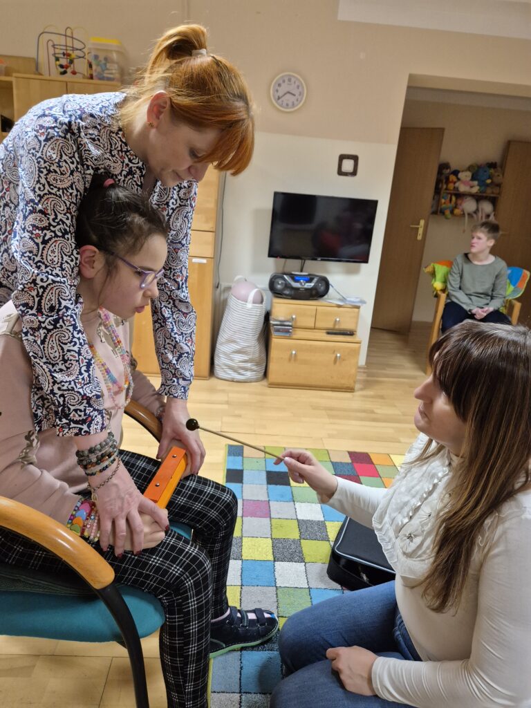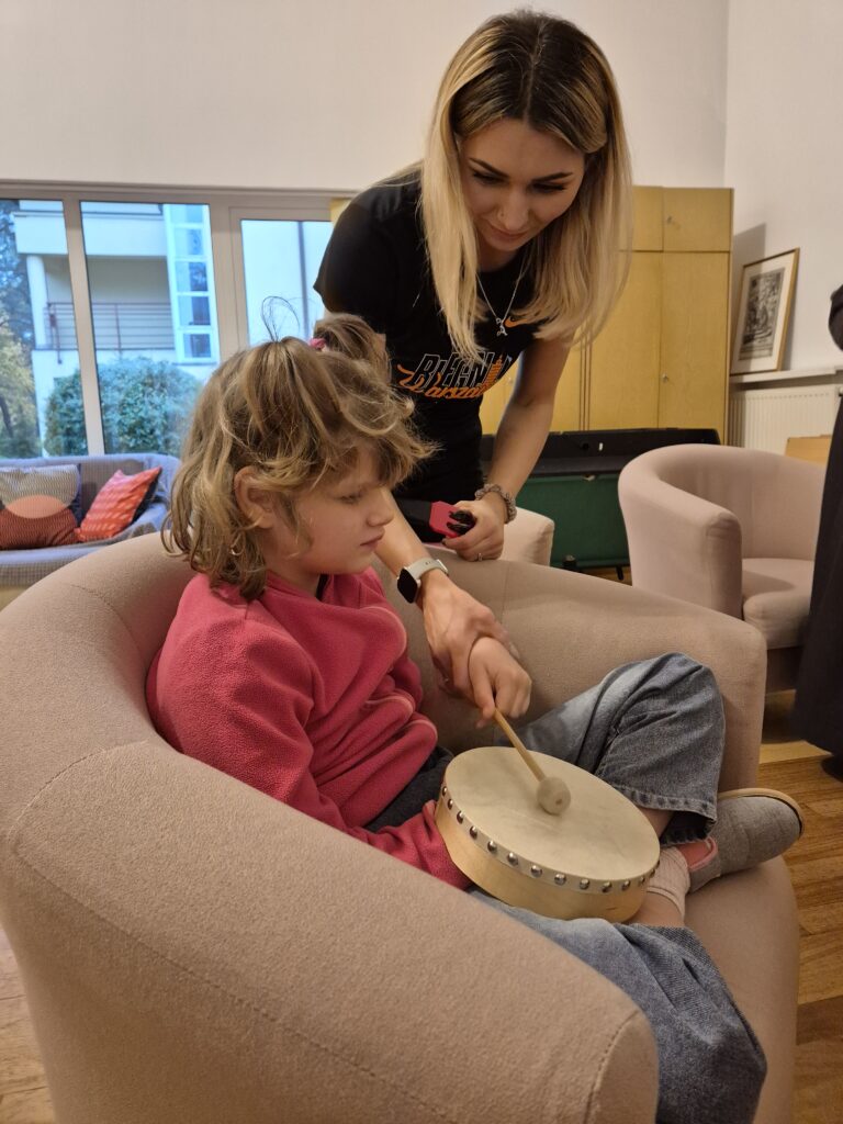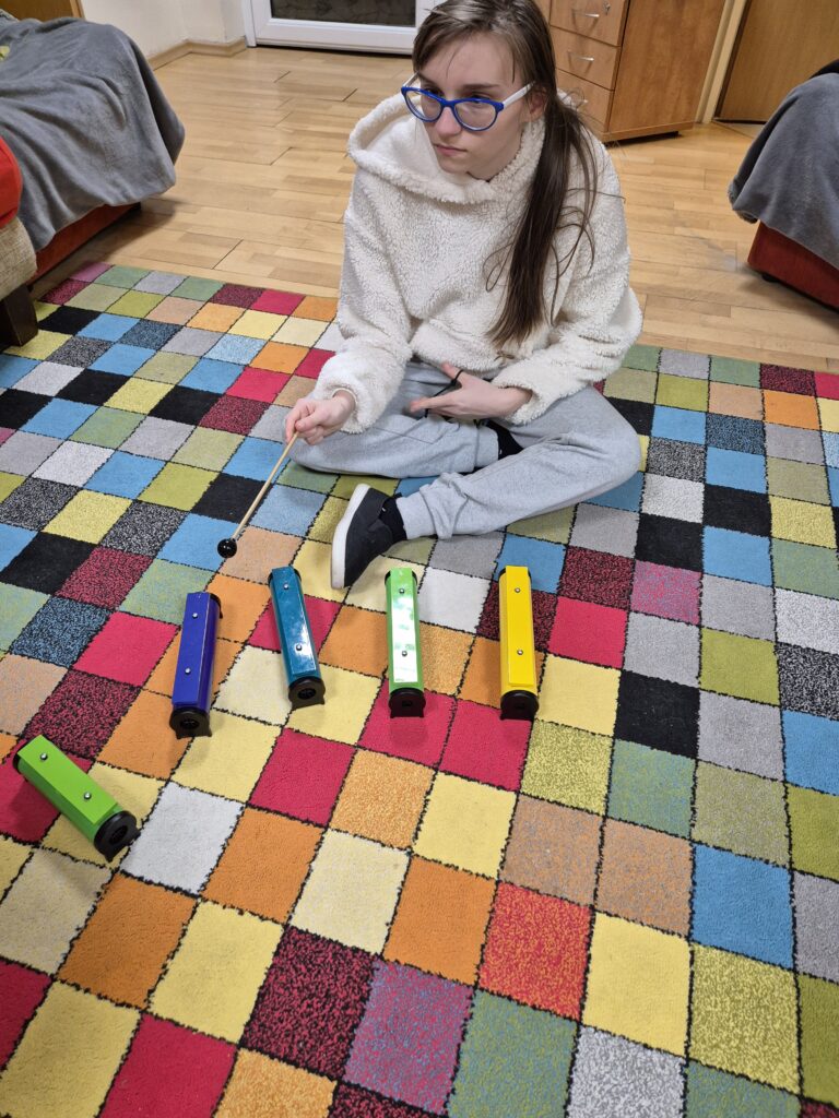 Zajęcia te niosą także ze sobą szereg unikalnych i niezwykle cennych korzyści. Muzyka jest potężnym narzędziem do wyrażania emocji, zarówno pozytywnych, jak i trudnych. Dziewczęta mogą w bezpieczny sposób przetwarzać uczucia, które często trudno jest im wyrazić słowami. Nauka prostych piosenek, melodii, rytmów oraz sekwencji dźwiękowych znacząco poprawia pamięć słuchową i zdolność koncentracji uwagi. Bardzo ciekawe jest wspólne tworzenie muzyki, które wymaga współpracy, słuchania pani Jadwigi a także siebie nawzajem, reagowania na innych. Uczy to komunikacji niewerbalnej, empatii i budowania relacji w grupie. Nawet najmniejsze osiągnięcia w grze na instrumentach : dzwonkach, tamburynach, powtarzanie słów piosenek budują pewność siebie i poczucie sprawczości.