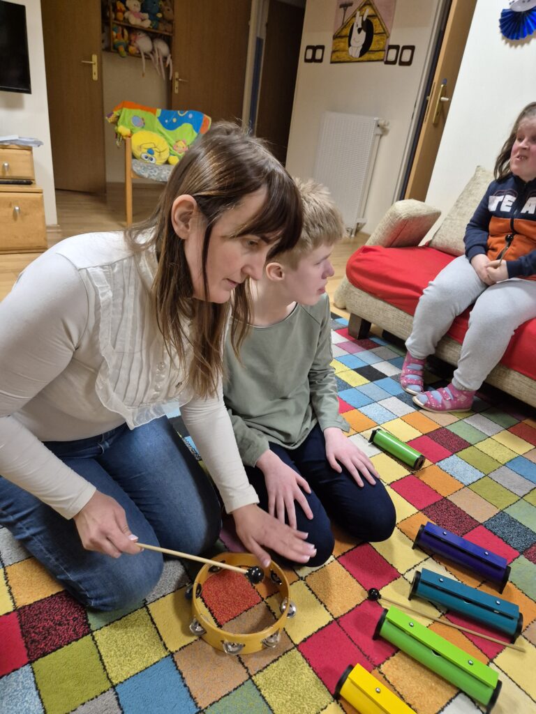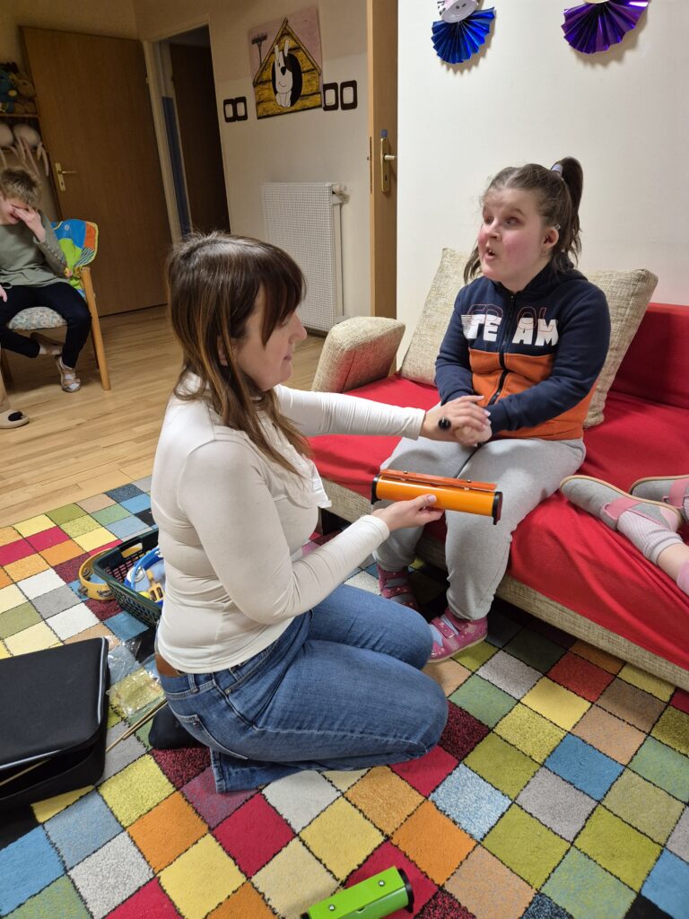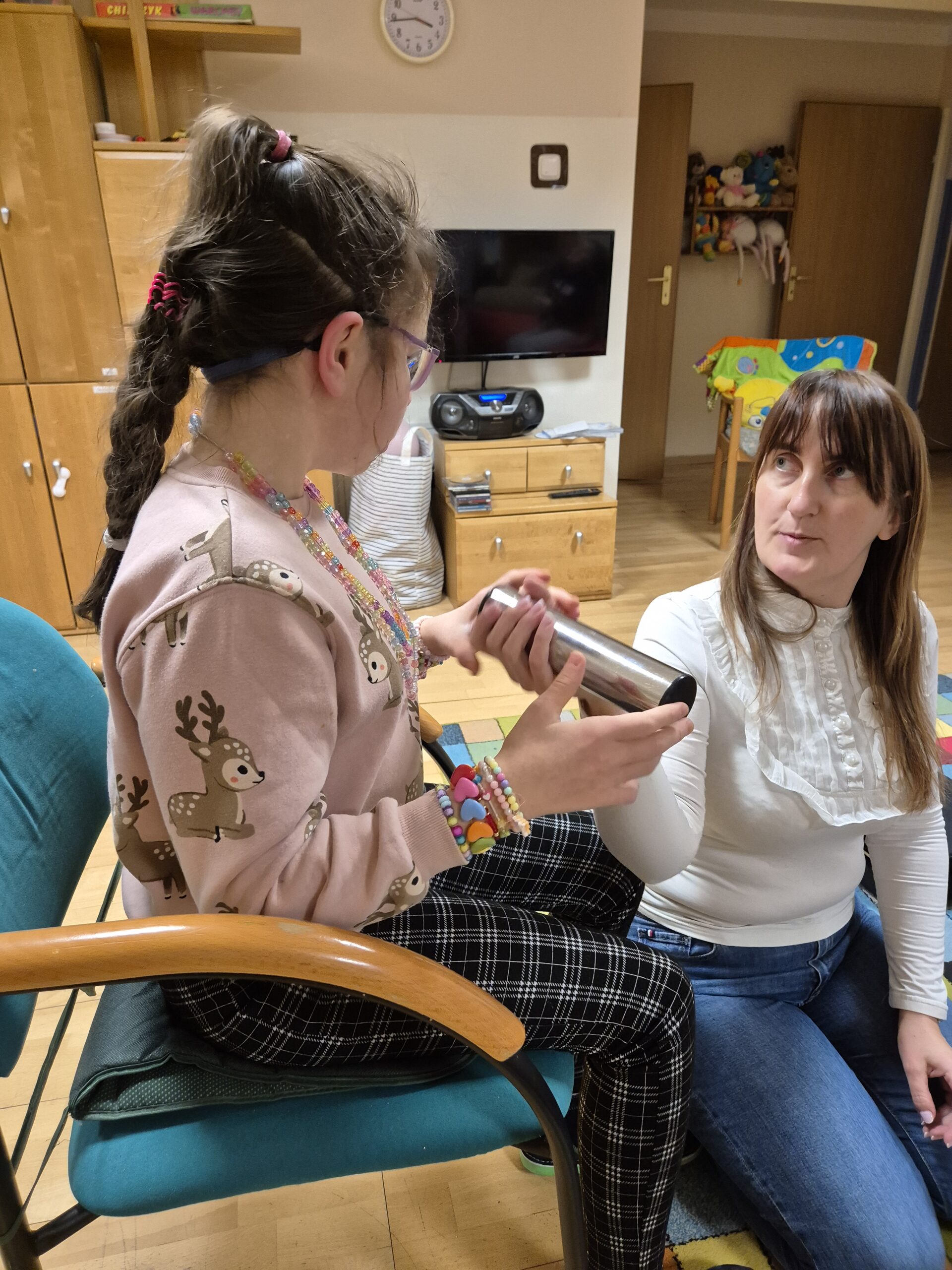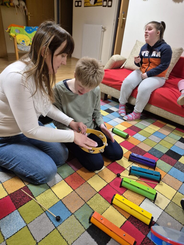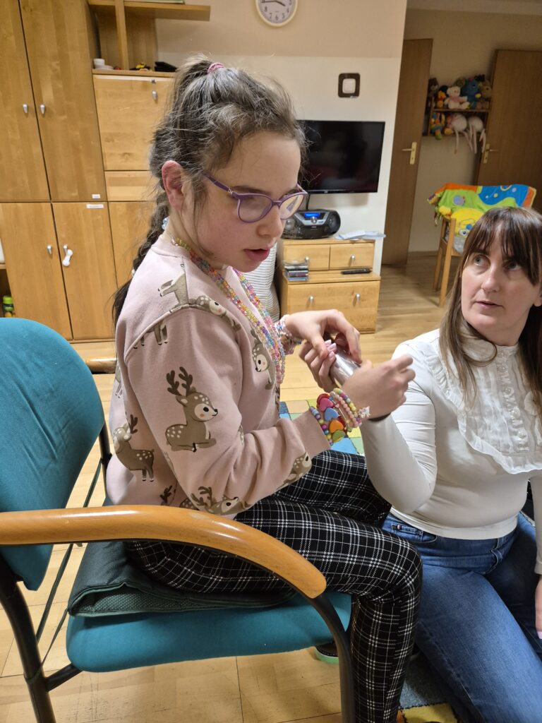 Zajęcia te niosą także ze sobą szereg unikalnych i niezwykle cennych korzyści. Muzyka jest potężnym narzędziem do wyrażania emocji, zarówno pozytywnych, jak i trudnych. Dziewczęta mogą w bezpieczny sposób przetwarzać uczucia, które często trudno jest im wyrazić słowami. Nauka prostych piosenek, melodii, rytmów oraz sekwencji dźwiękowych znacząco poprawia pamięć słuchową i zdolność koncentracji uwagi. Bardzo ciekawe jest wspólne tworzenie muzyki, które wymaga współpracy, słuchania pani Jadwigi a także siebie nawzajem, reagowania na innych. Uczy to komunikacji niewerbalnej, empatii i budowania relacji w grupie. Nawet najmniejsze osiągnięcia w grze na instrumentach : dzwonkach, tamburynach, powtarzanie słów piosenek budują pewność siebie i poczucie sprawczości.