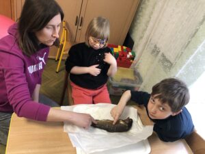 Przedszkolaki dowiedziały się, jak pozyskuje się sól i węgiel i po co są nam potrzebne, jak wygląda praca górnika oraz jak dbać o nieodnawialne skarby Ziemi. Jak zawsze poznawaliśmy tajemnice Ziemi wszystkimi zmysłami: oglądaliśmy różnej wielkości bryłki soli i węgla, sprawdziliśmy, czy sól morska i kamienna jest tak samo słona, wąchaliśmy pachnącą sól do kąpieli, myliśmy dłonie błotno-solnym mydłem, próbowaliśmy rysować węglem, robiliśmy solne eksperymenty z wodą, oglądaliśmy filmik edukacyjny o pracy górnika, wykleiliśmy wagoniki wiozące sól z kopalni, słuchaliśmy różnych odgłosów Ziemi.
